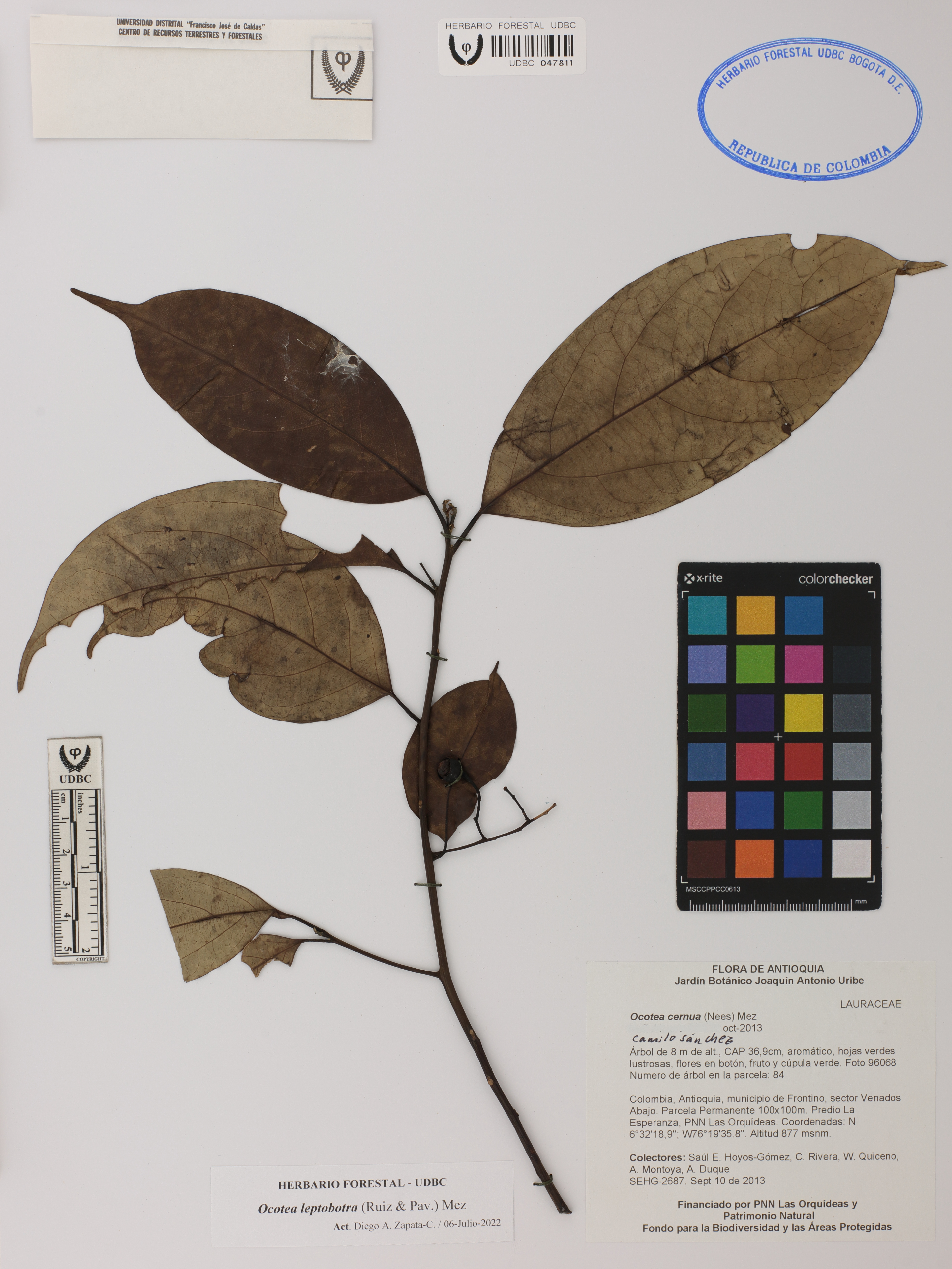 Fotografía del ejemplar Hoyos-Gómez, S. 2687, determinado como Ocotea leptobotra en el año 2013