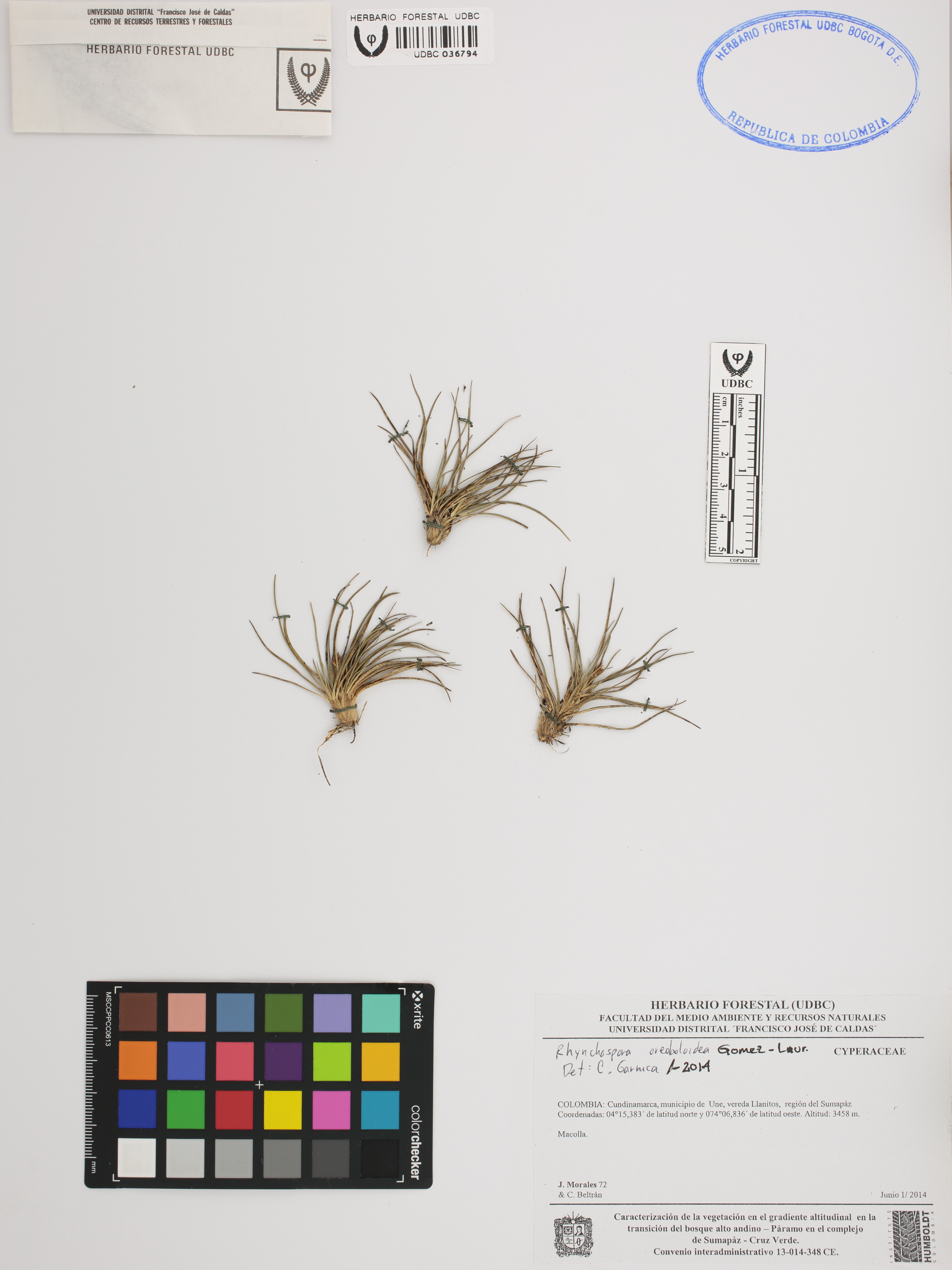 Fotografía del ejemplar Morales, J. 72, determinado como Rhynchospora oreoboloidea en el año 2014