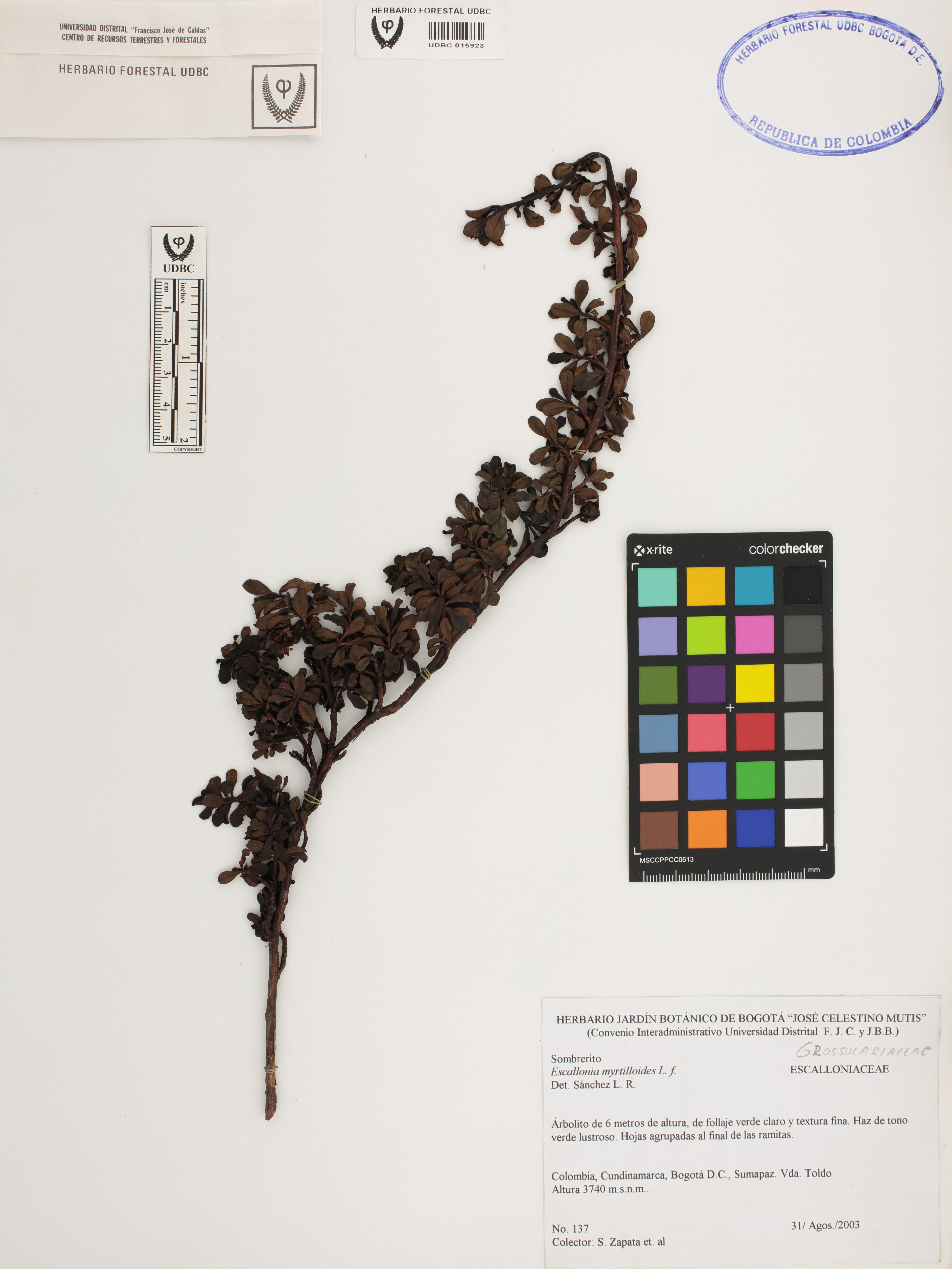 Fotografía del ejemplar Zapata, S. 137, determinado como Escallonia myrtilloides