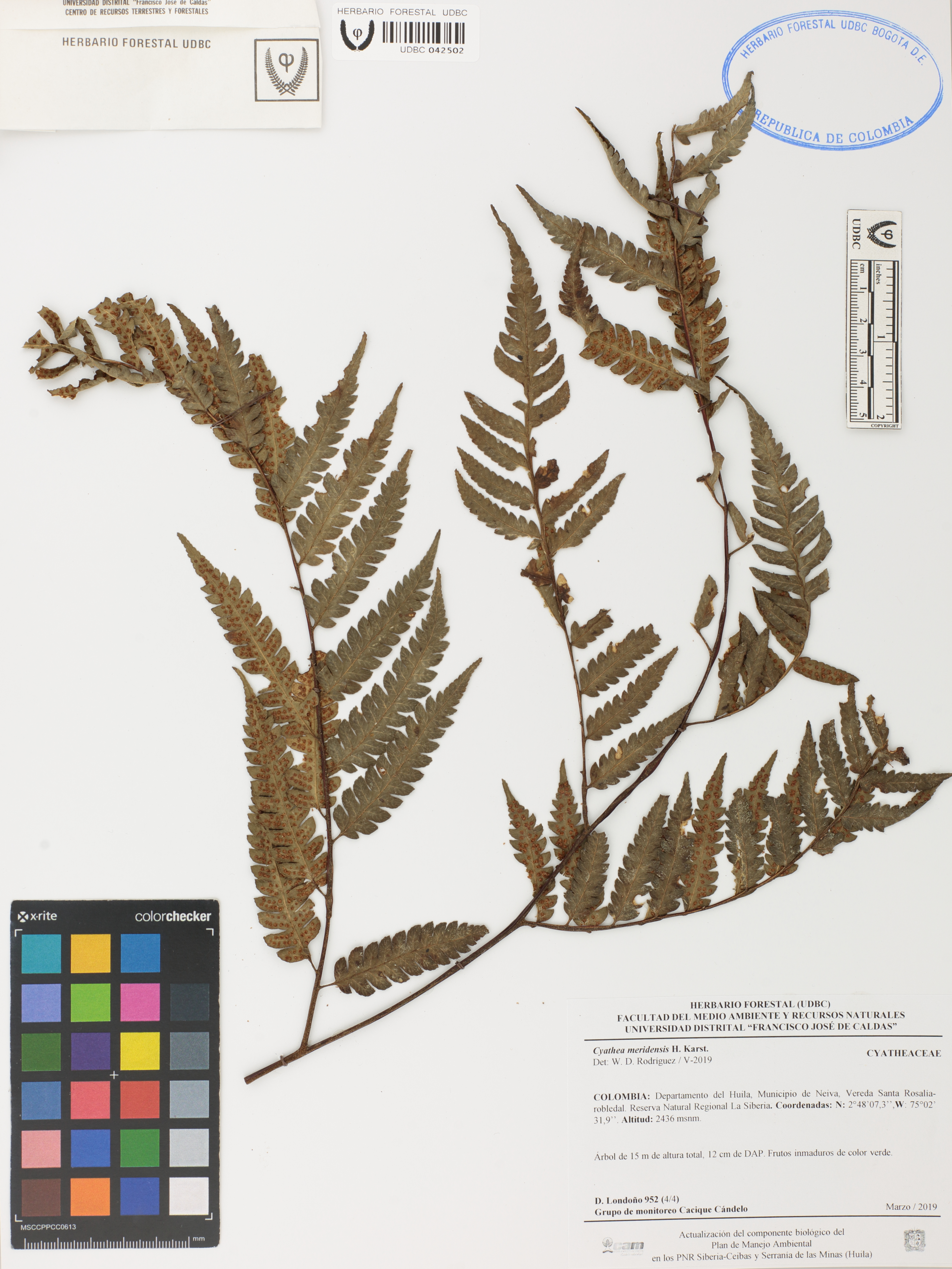 Fotografía del ejemplar Londoño, D. 952 (4/4), determinado como Cyathea meridensis en el año 2019