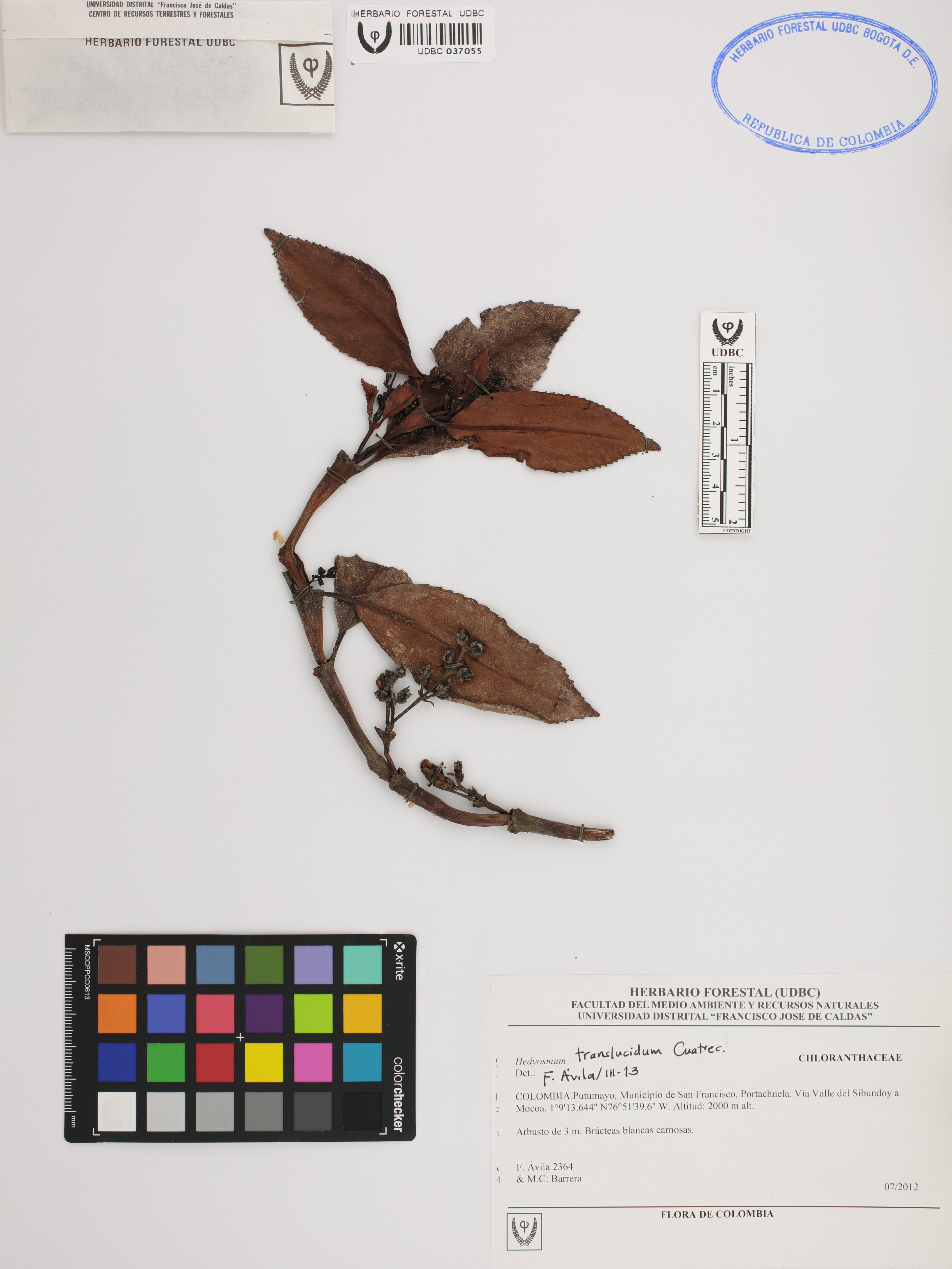 Fotografía del ejemplar Ávila, F. 2364, determinado como Hedyosmum translucidum en el año 2013