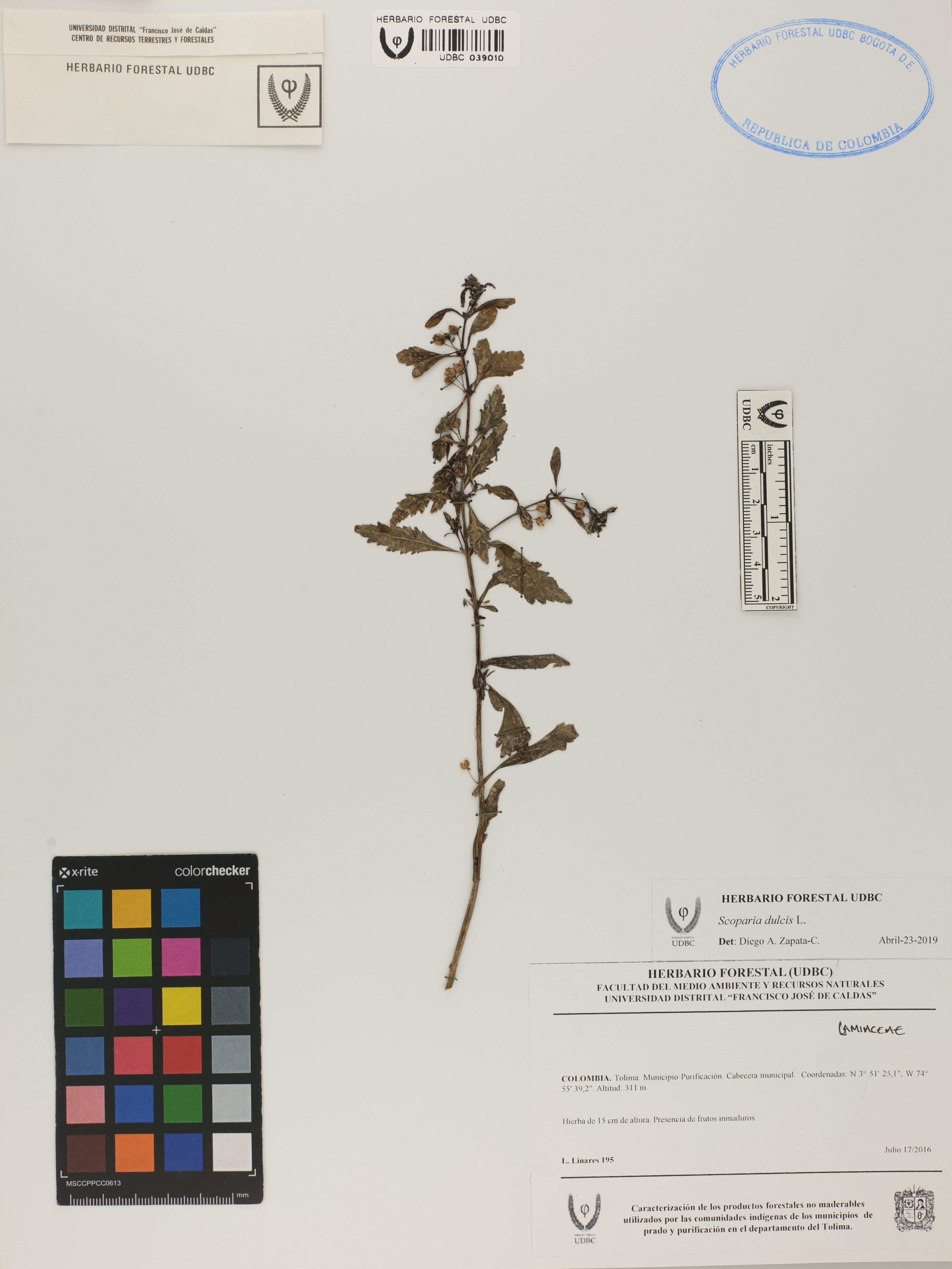 Fotografía del ejemplar Linares, L. 195, determinado como Scoparia dulcis en el año 2019