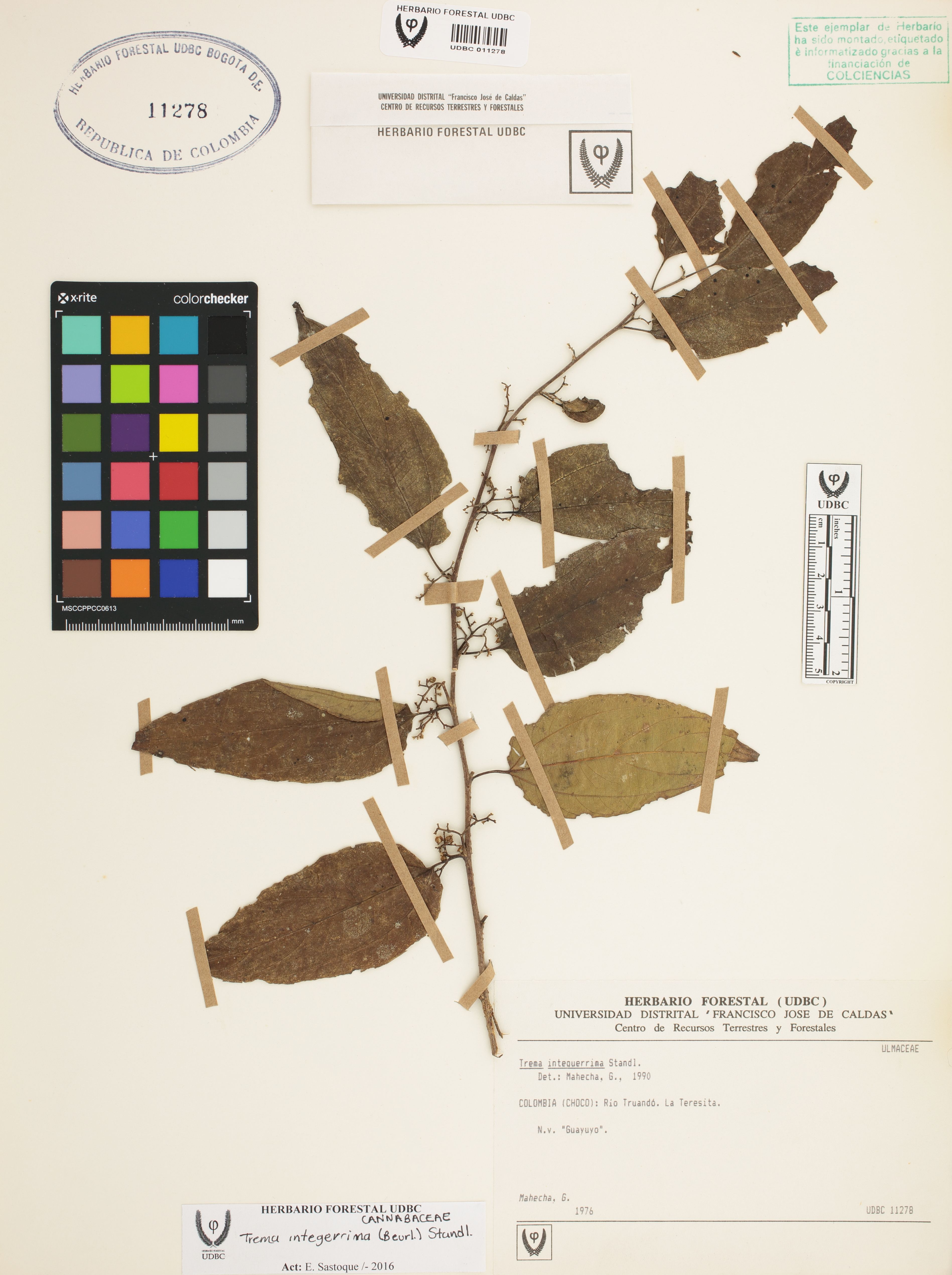 Fotografía del ejemplar Mahecha, G., determinado como Trema integerrimum en el año 1990