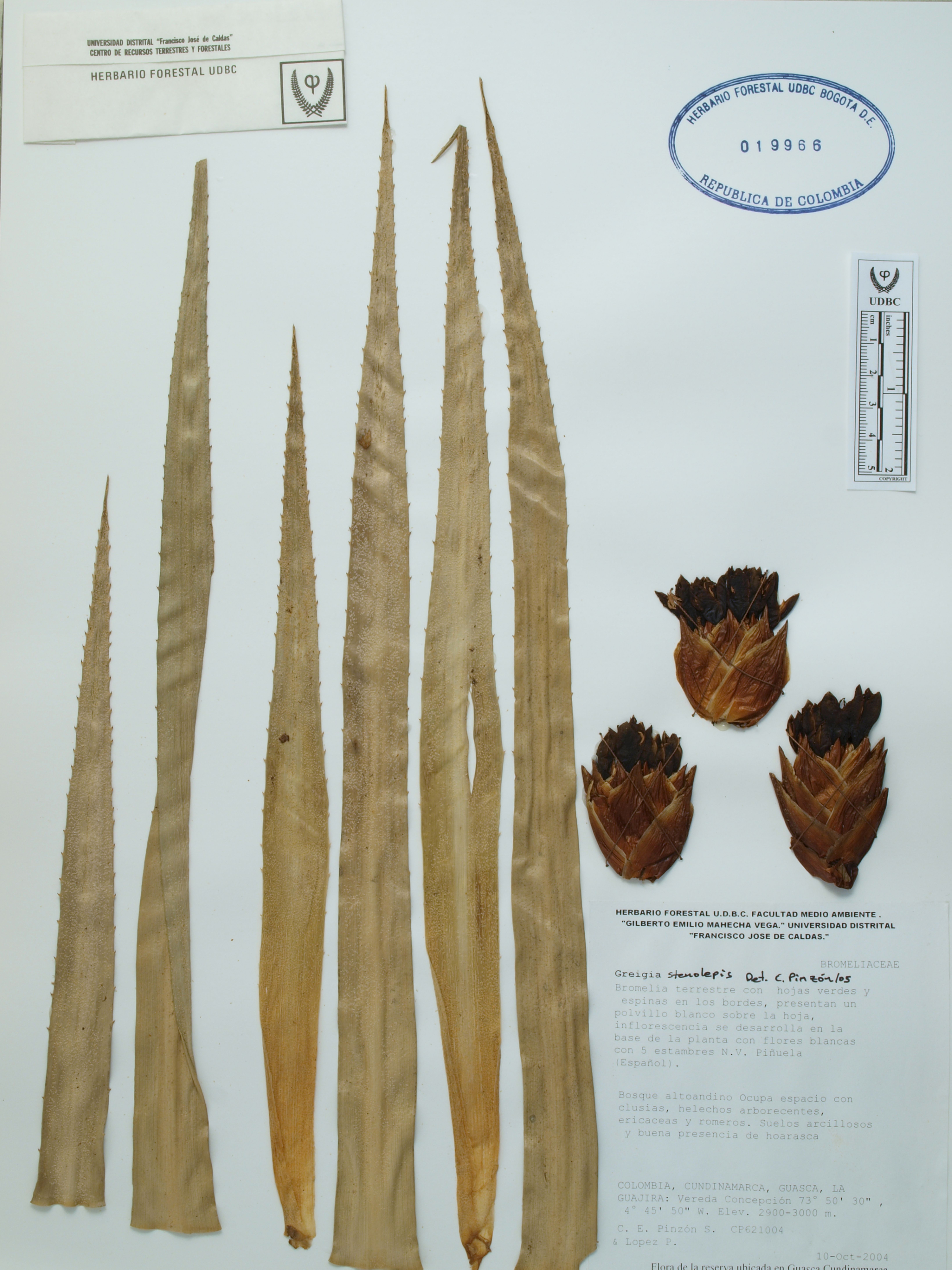 Fotografía del ejemplar Pinzón-S., C., determinado como Greigia stenolepis en el año 2005