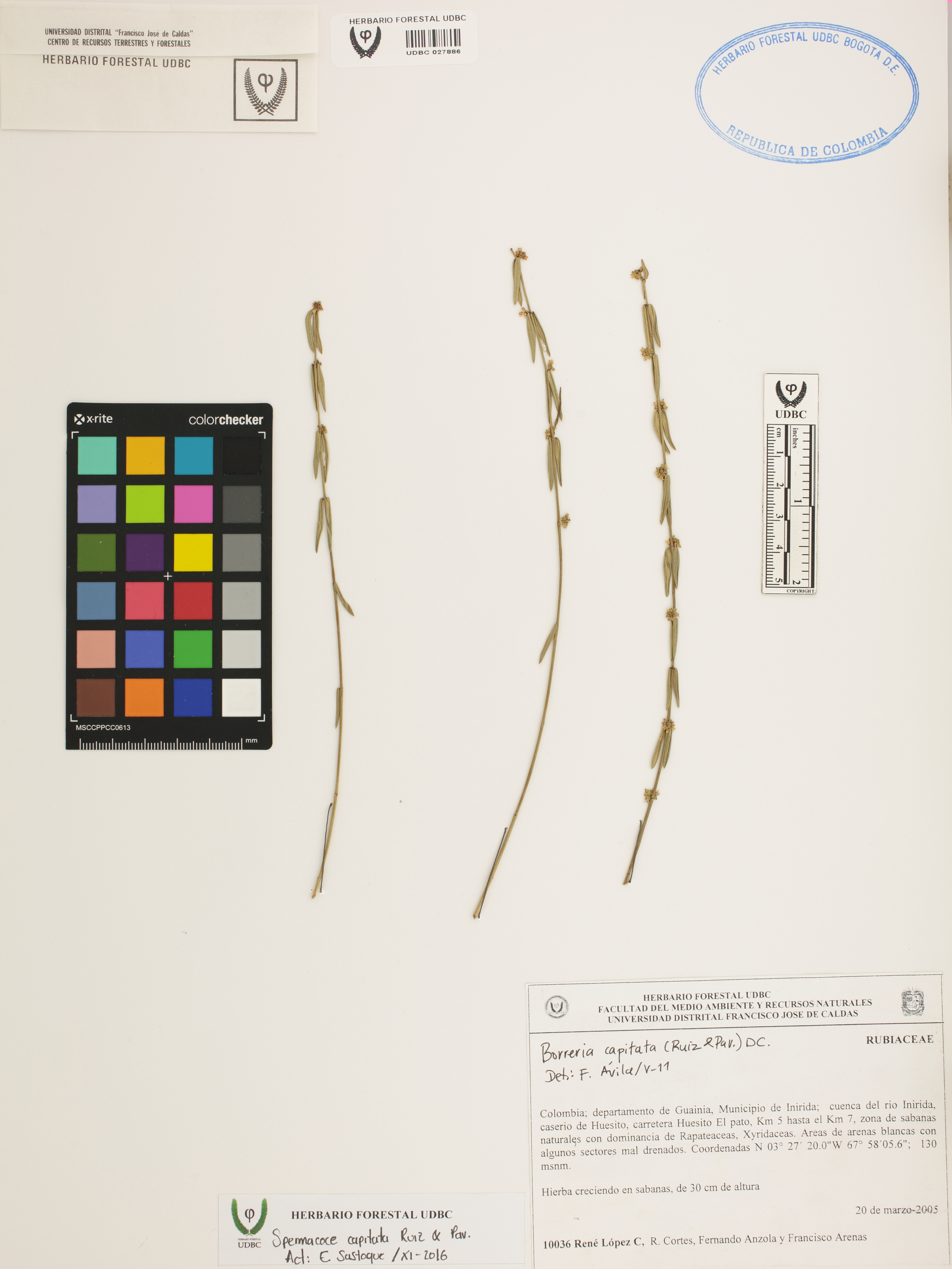 Fotografía del ejemplar López, R. 10036, determinado como Spermacoce capitata en el año 2011