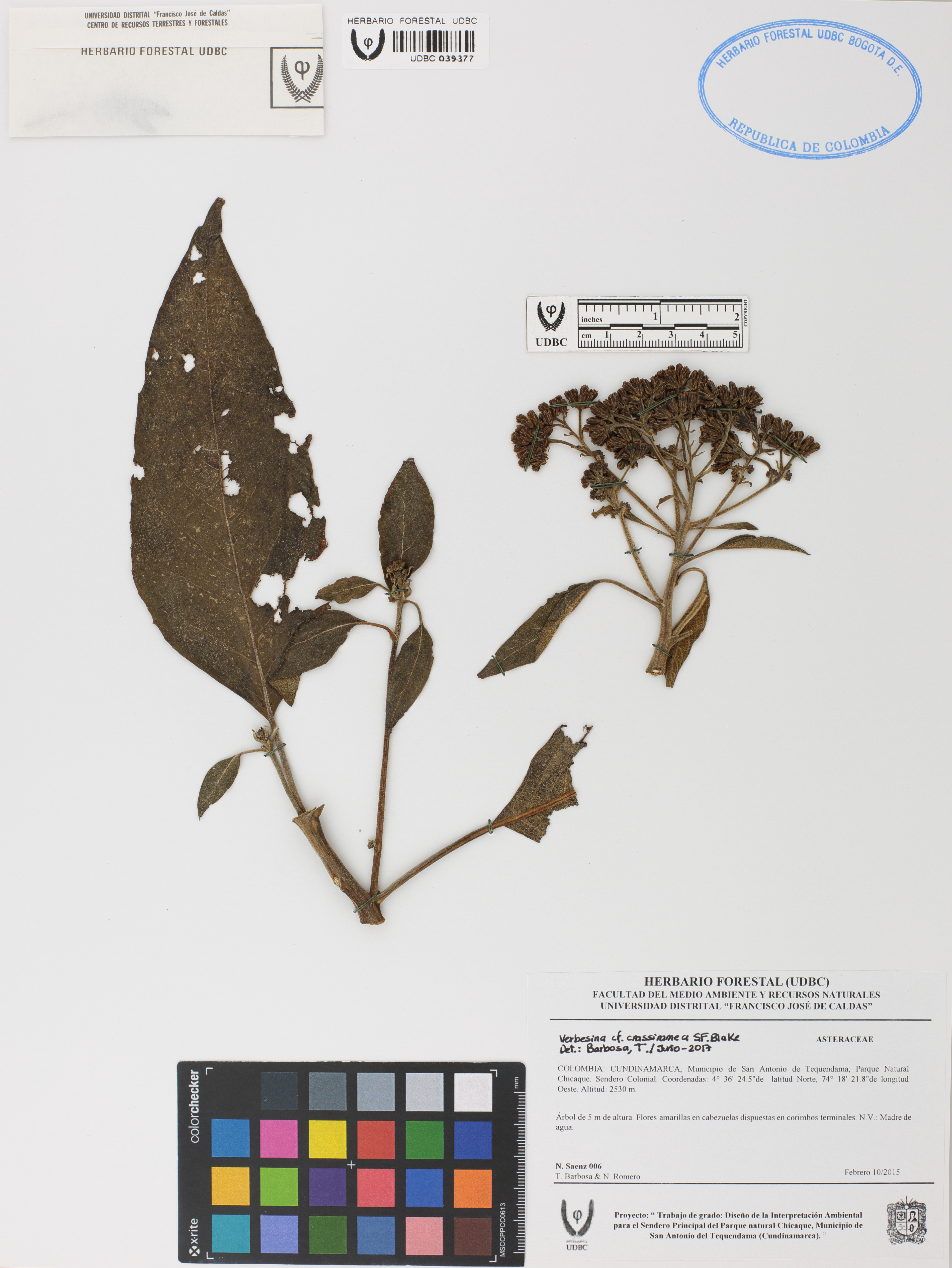 Fotografía del ejemplar Sáenz, N. 6, determinado como Verbesina crassiramea en el año 2017