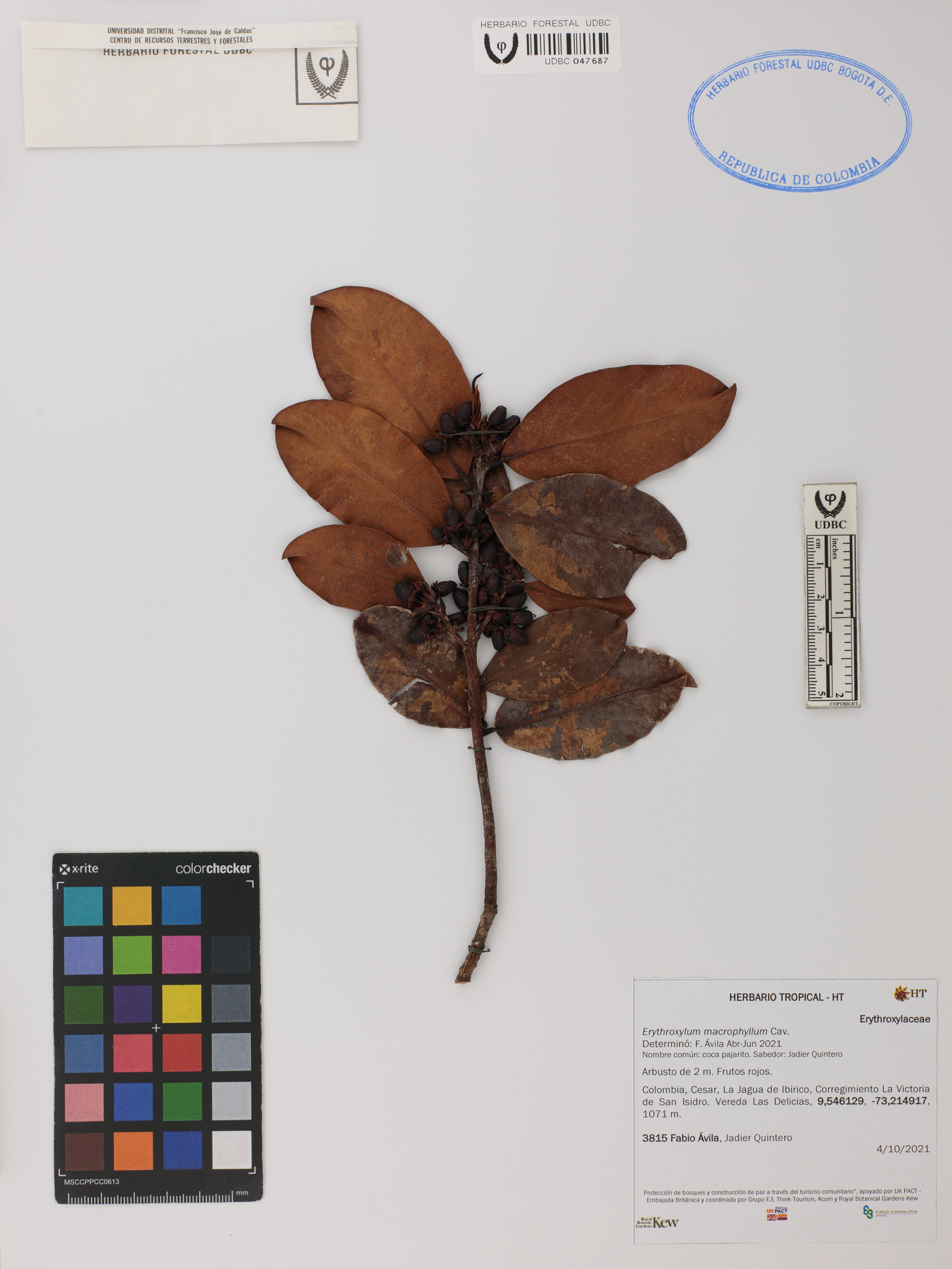 Fotografía del ejemplar Ávila, F. 3815, determinado como Erythroxylum macrophyllum en el año 2022
