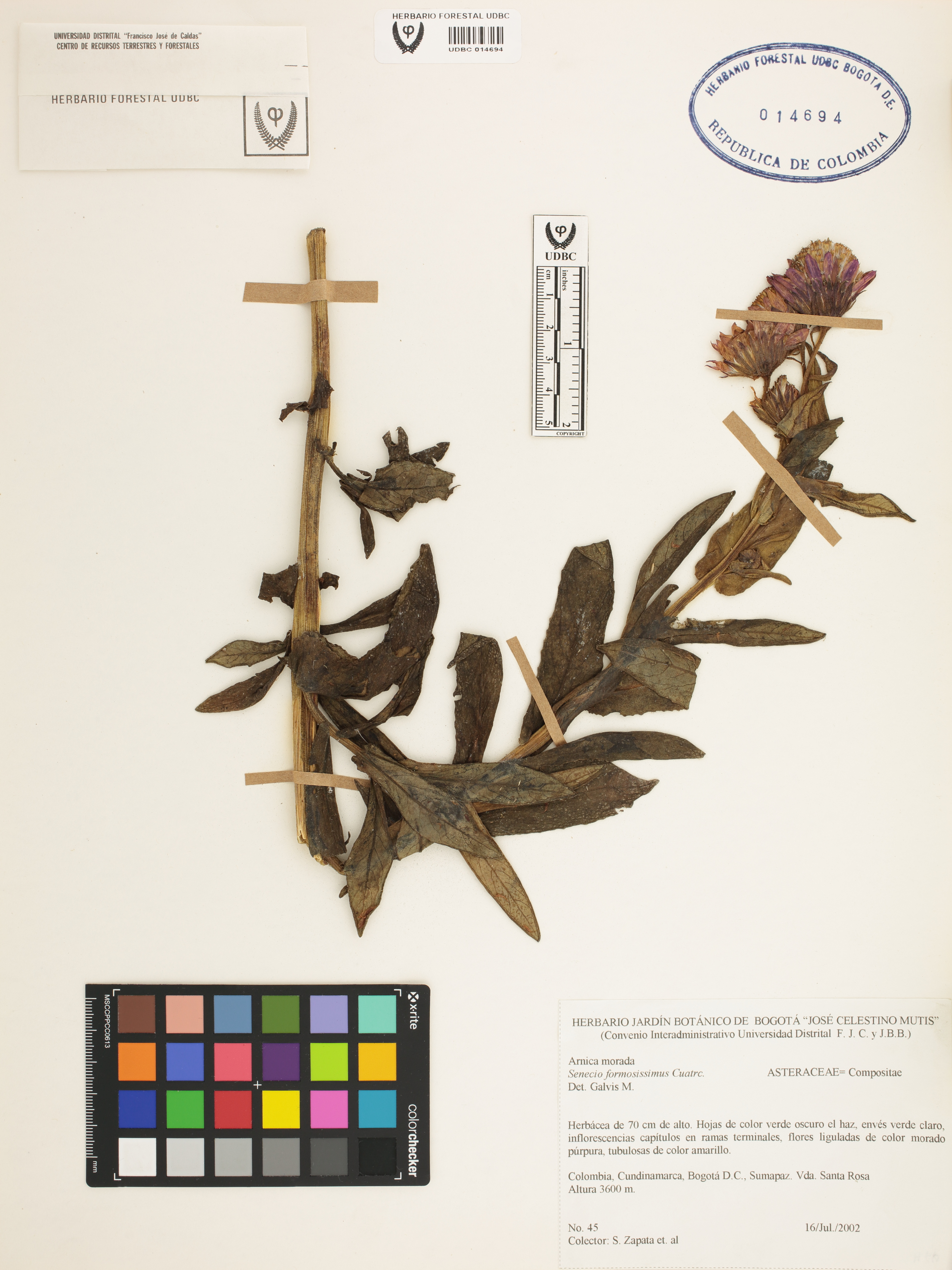 Fotografía del ejemplar Zapata, S. 45, determinado como Senecio formosissimus