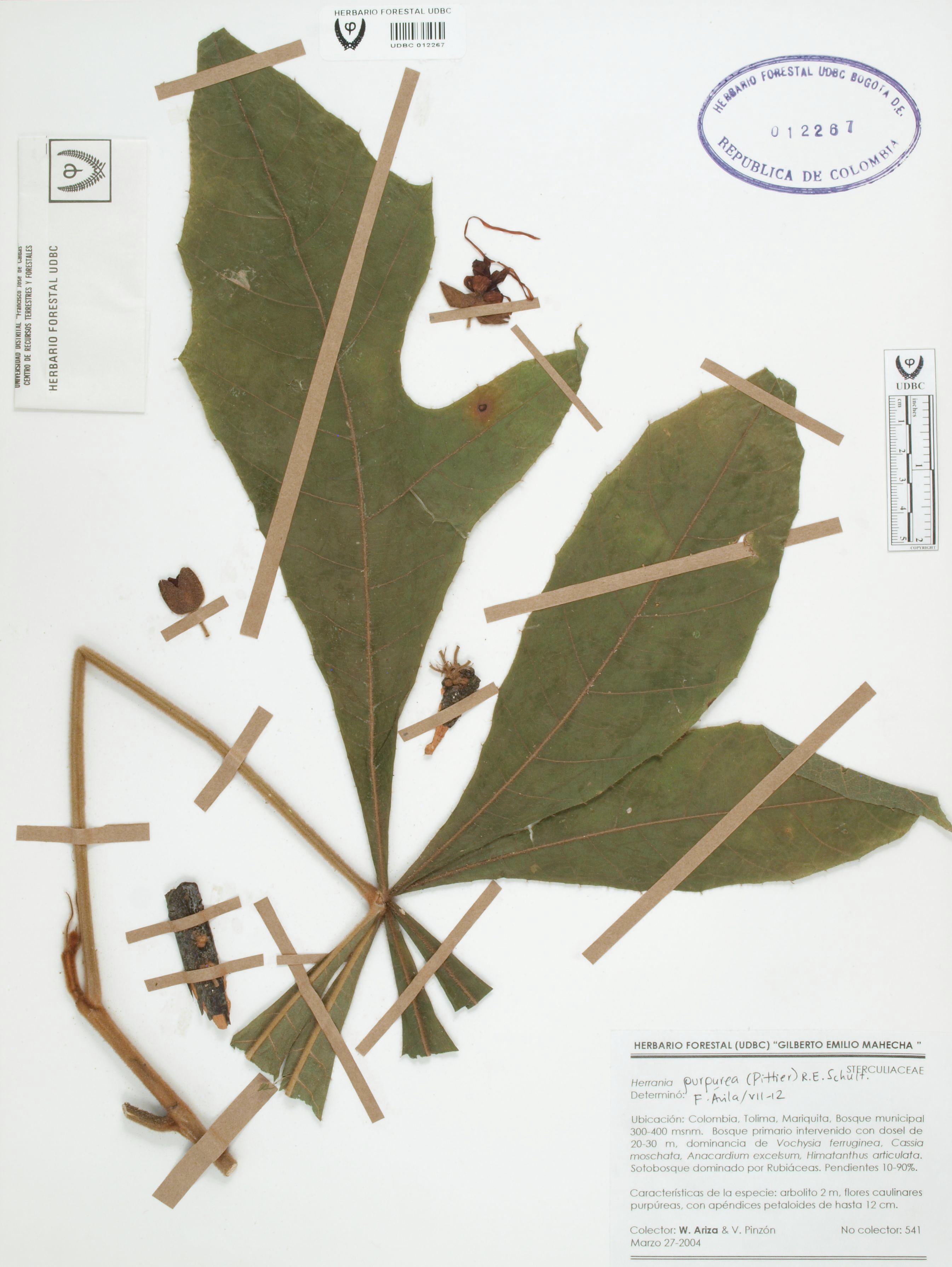 Fotografía del ejemplar Ariza, W. 541, determinado como Theobroma purpureum en el año 2012