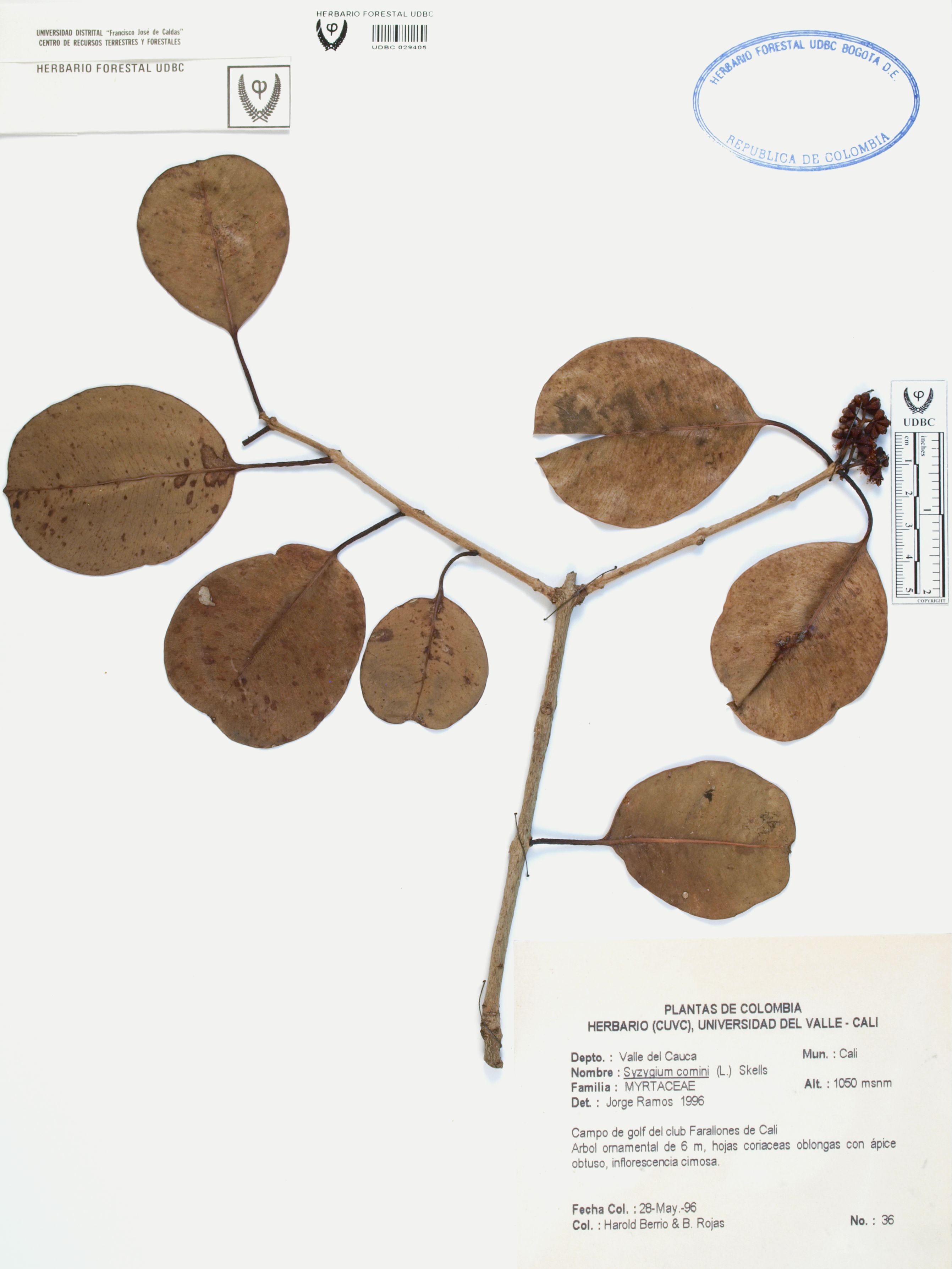 Fotografía del ejemplar Berrío, H. 36, determinado como Syzygium cumini en el año 1996