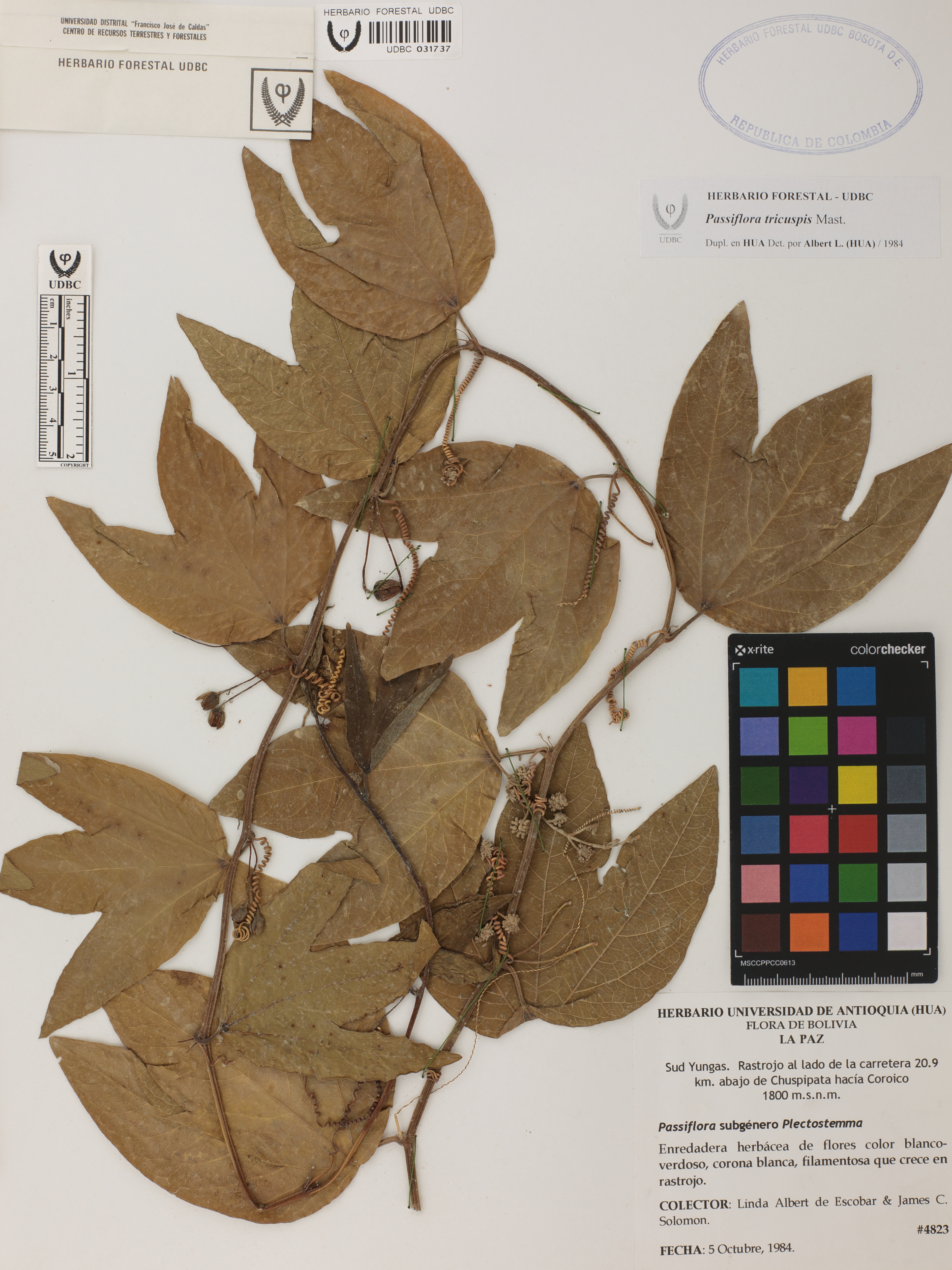 | dc.description | Fotografía del ejemplar Albert de Escobar, L. 4823, determinado como Passiflora tricuspis en el año 1984 | |