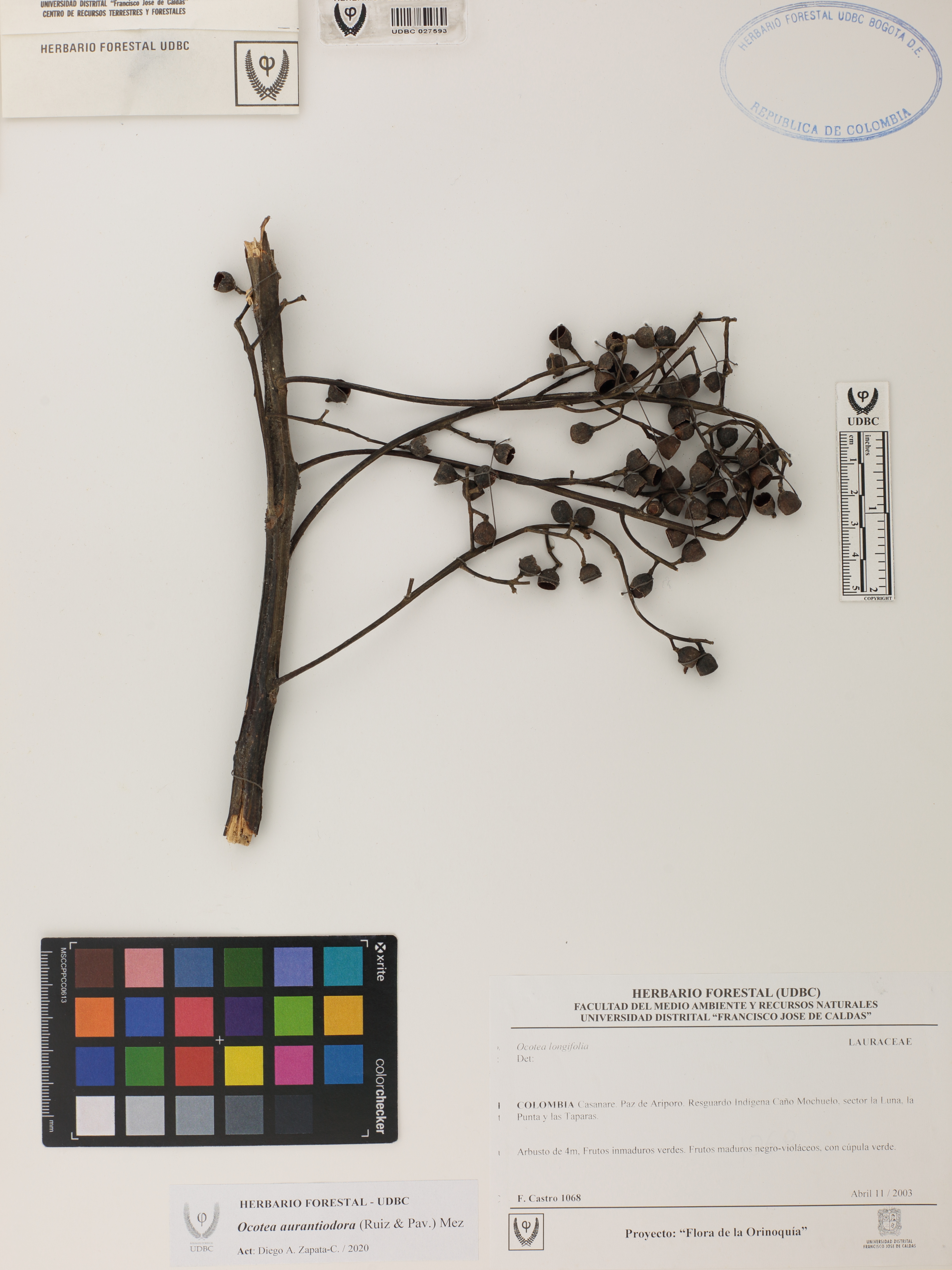 Fotografía del ejemplar Castro, F. 1068, determinado como Ocotea aurantiodora en el año 2003