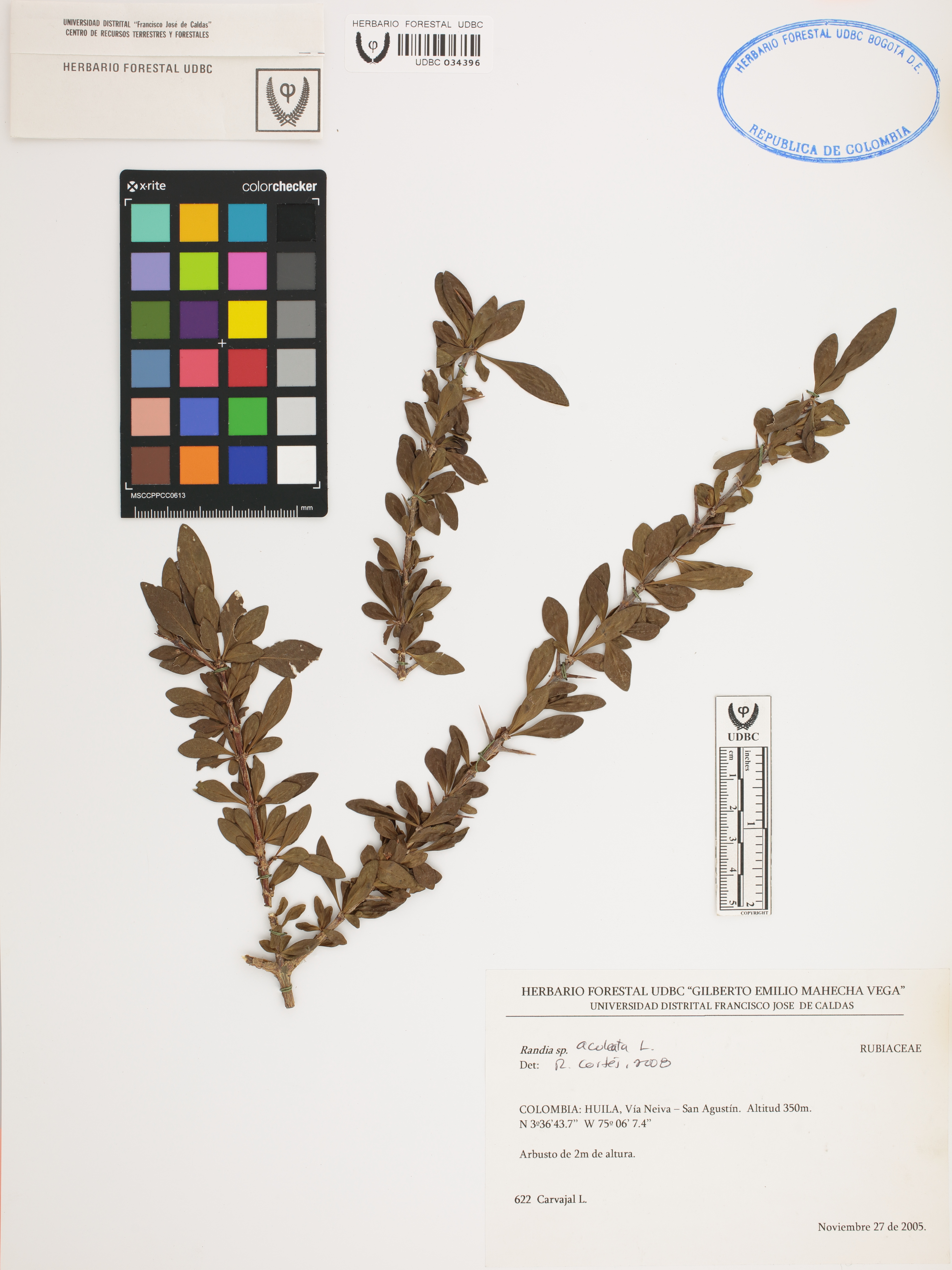 Fotografía del ejemplar Carvajal, L. 622, determinado como Randia aculeata en el año 2008