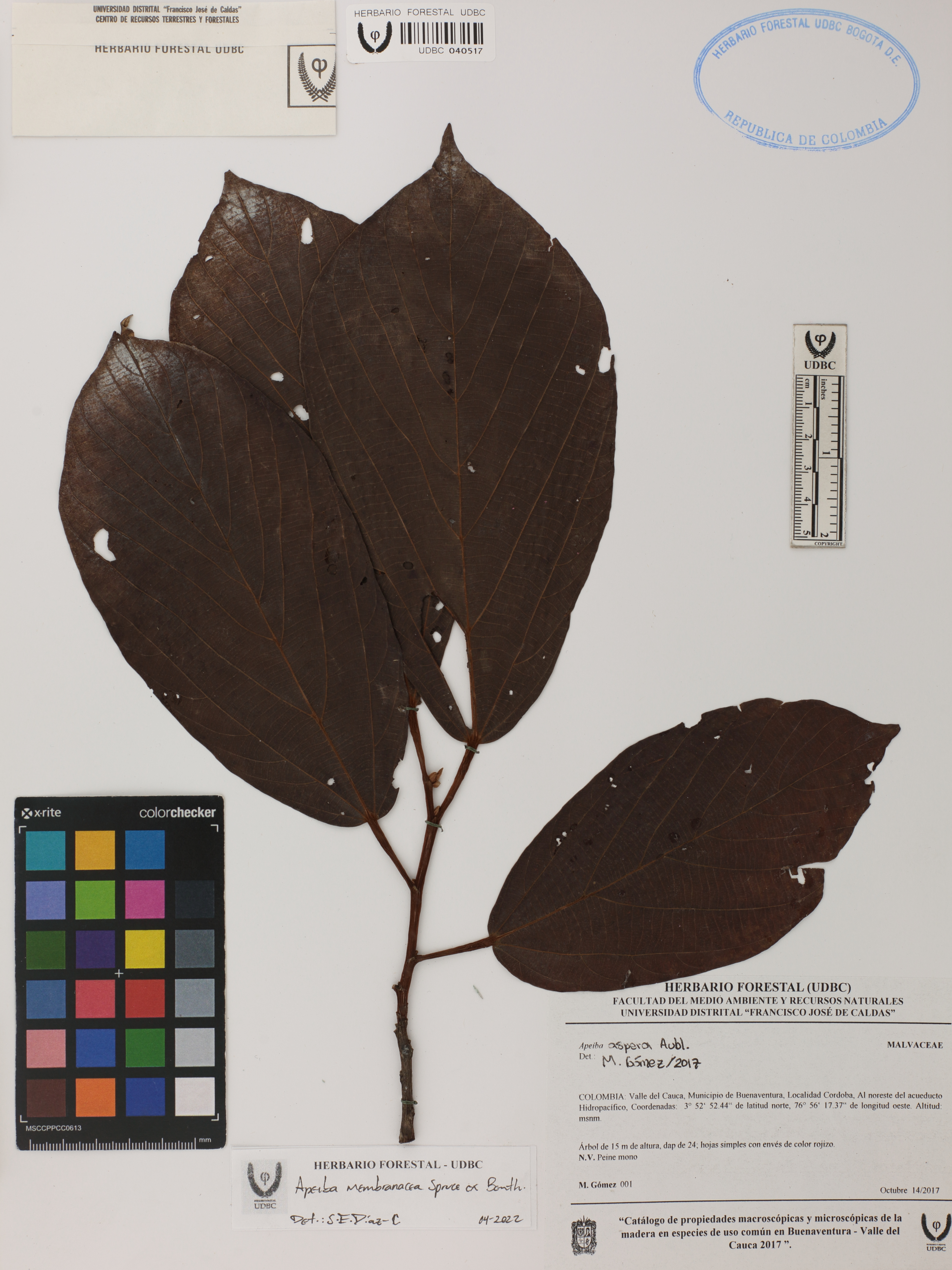 Fotografía del ejemplar Gómez, M. 1, determinado como Apeiba membranacea en el año 2022