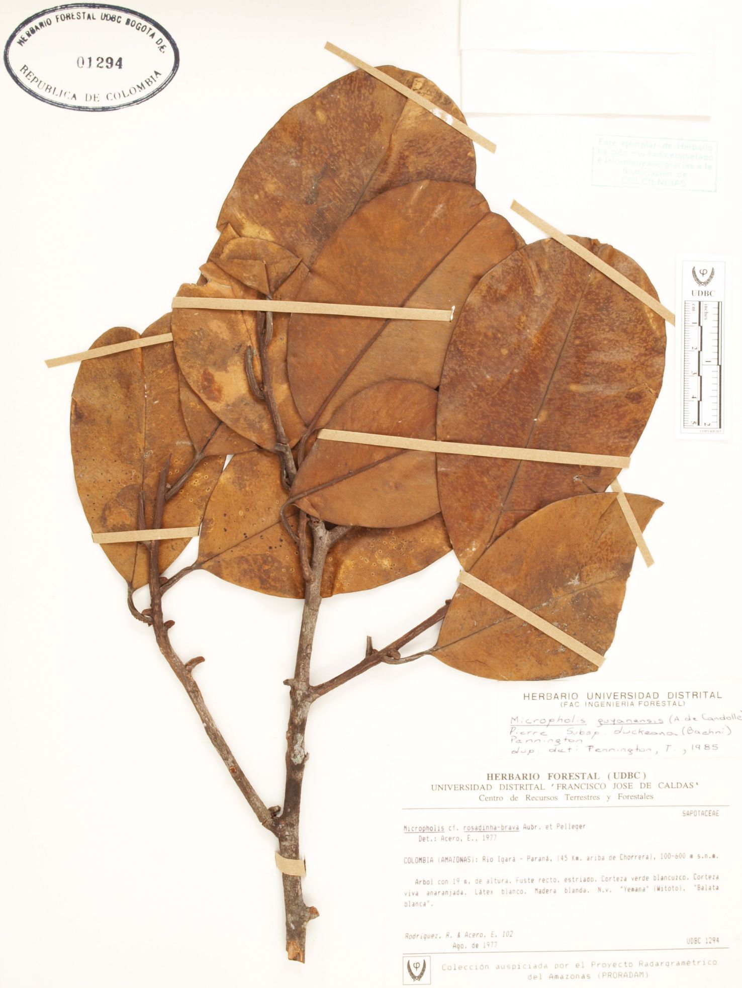 Fotografía del ejemplar Rodríguez, R. 102, determinado como Micropholis guyanensis subsp. duckeana en el año 1985