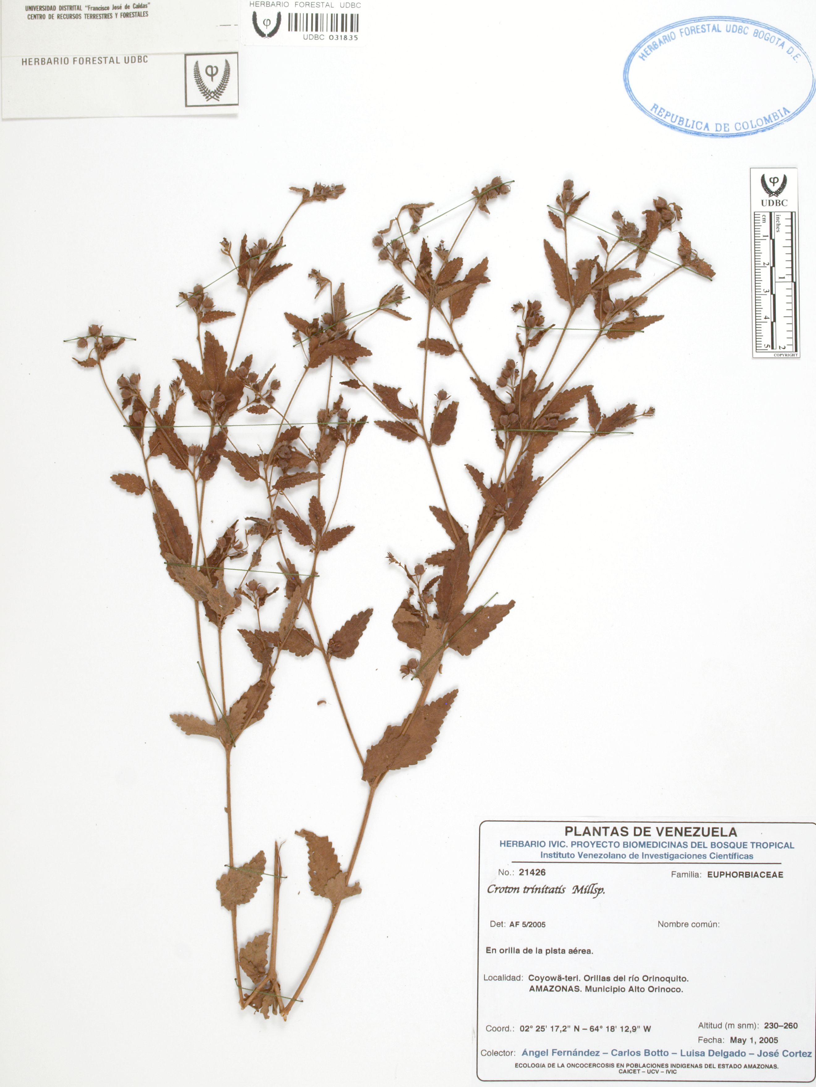 Fotografía del ejemplar Fernández, A. 21426, determinado como Croton trinitatis en el año 2005