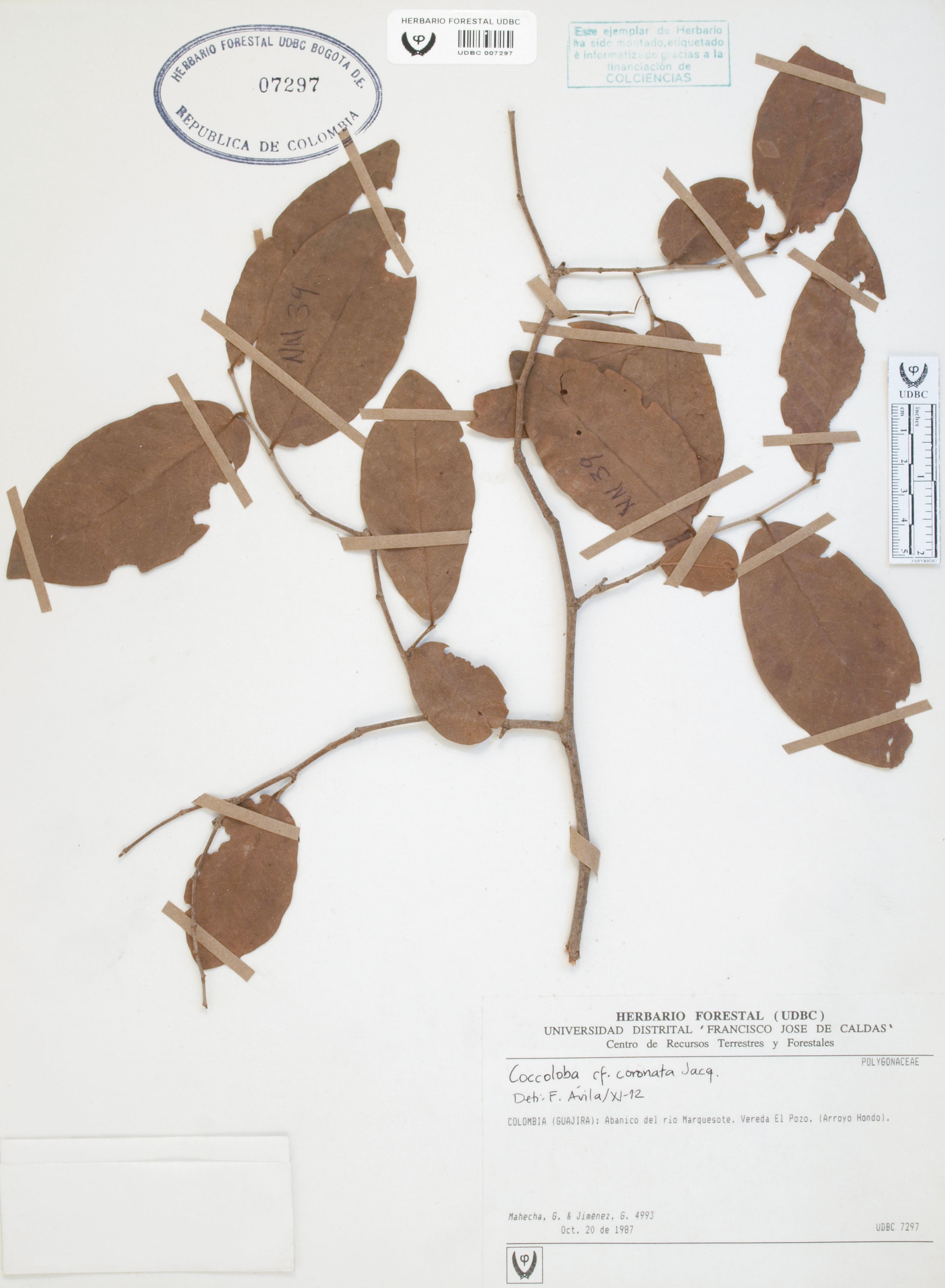 Fotografía del ejemplar Mahecha, G. 4993, determinado como Coccoloba coronata en el año 2012