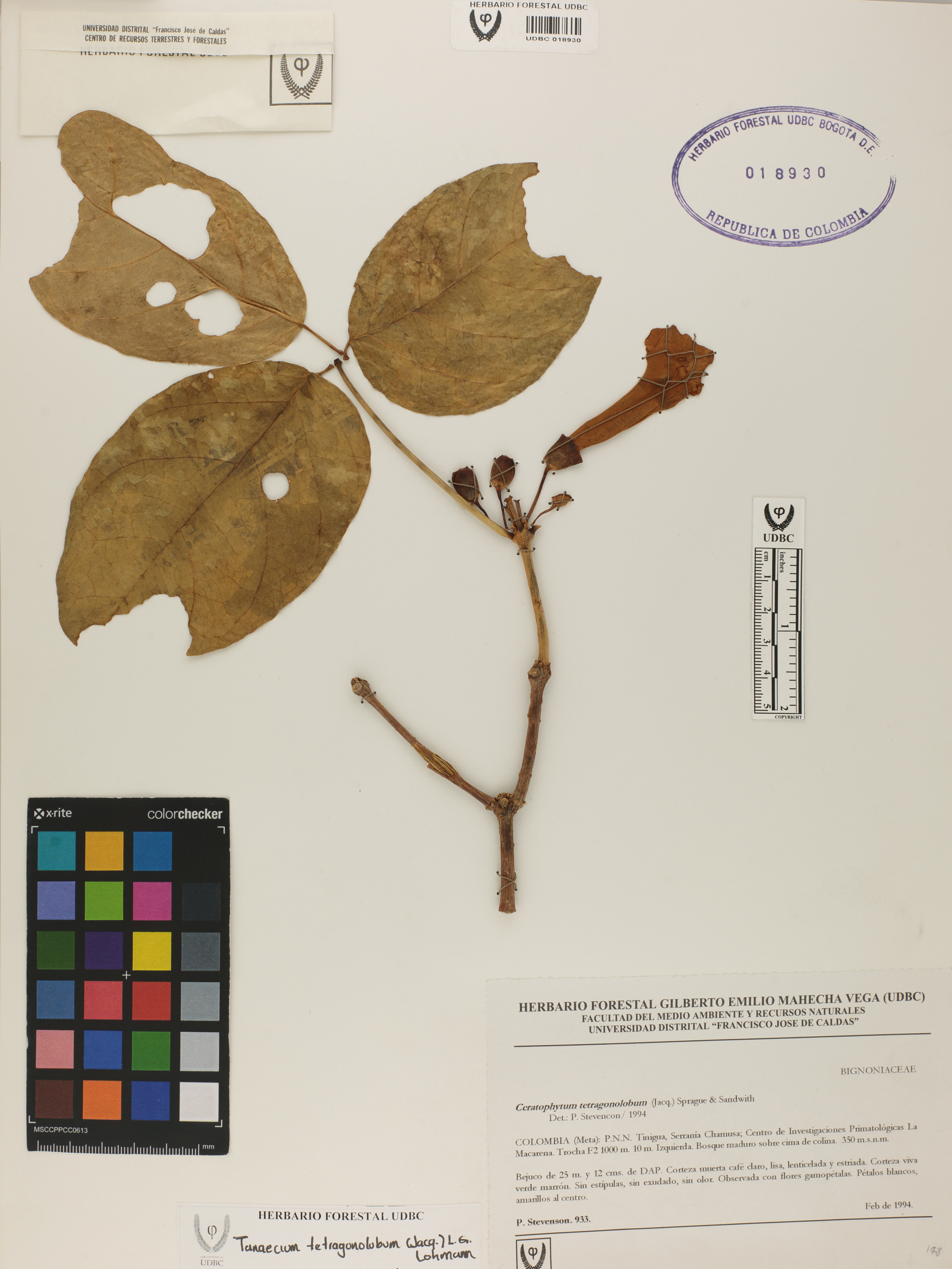 Fotografía del ejemplar Stevenson, P. 933, determinado como Tanaecium tetragonolobum en el año 1994