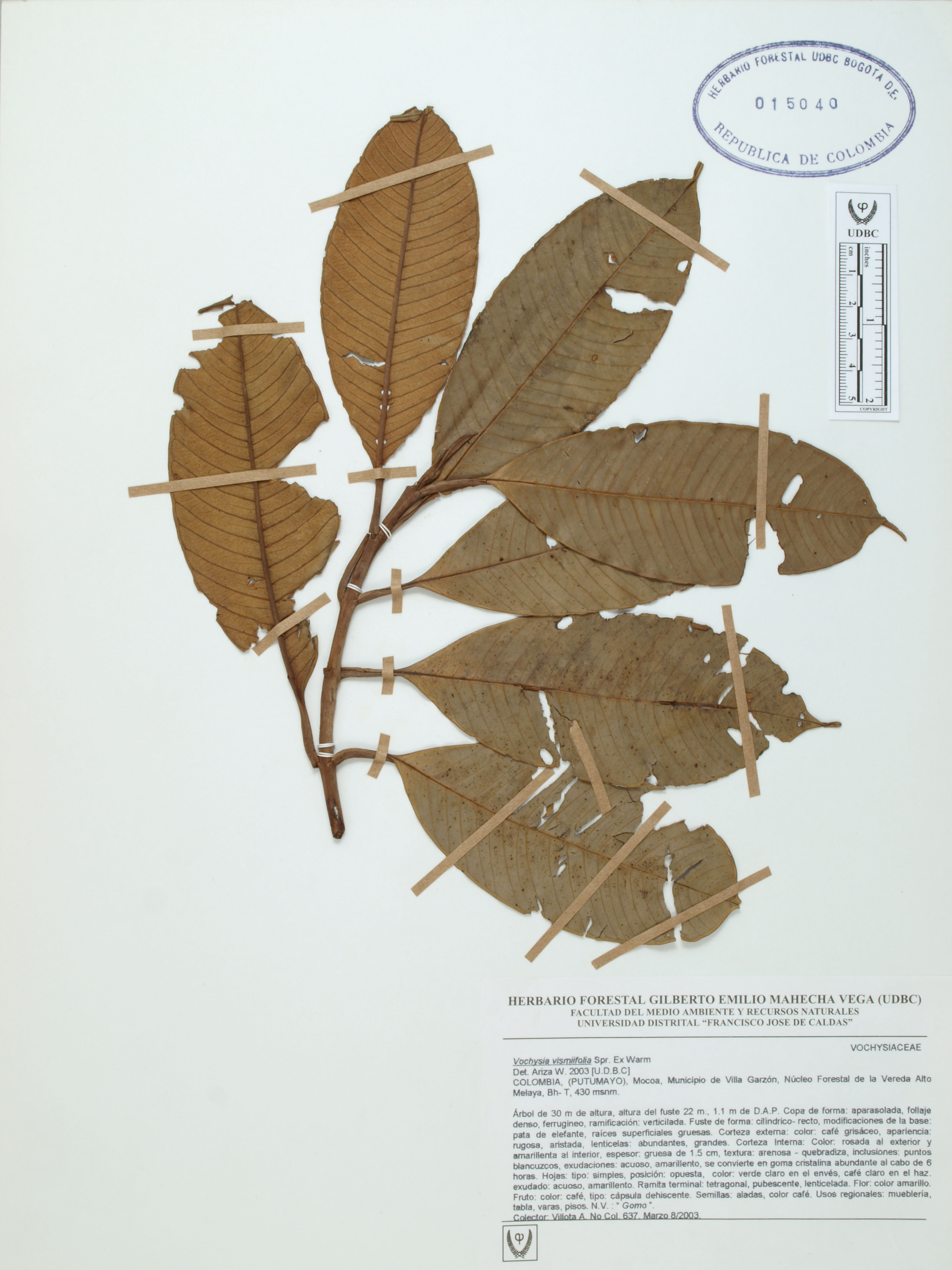 | dc.description | Fotografía del ejemplar Villota, A. 637, determinado como Vochysia vismiifolia en el año 2003 | |