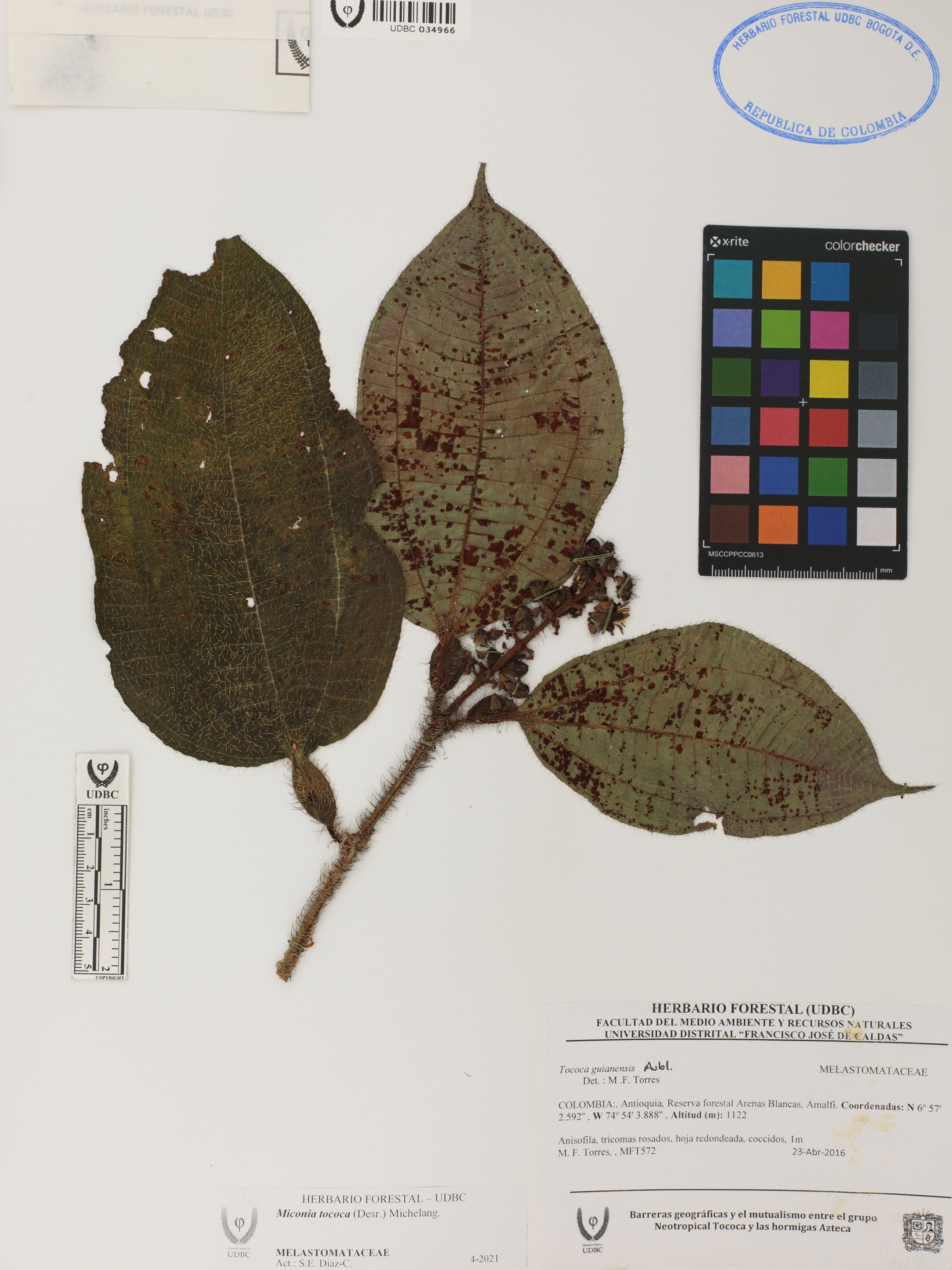 Fotografía del ejemplar Torres, M. 572, determinado como Miconia tococa en el año 2016
