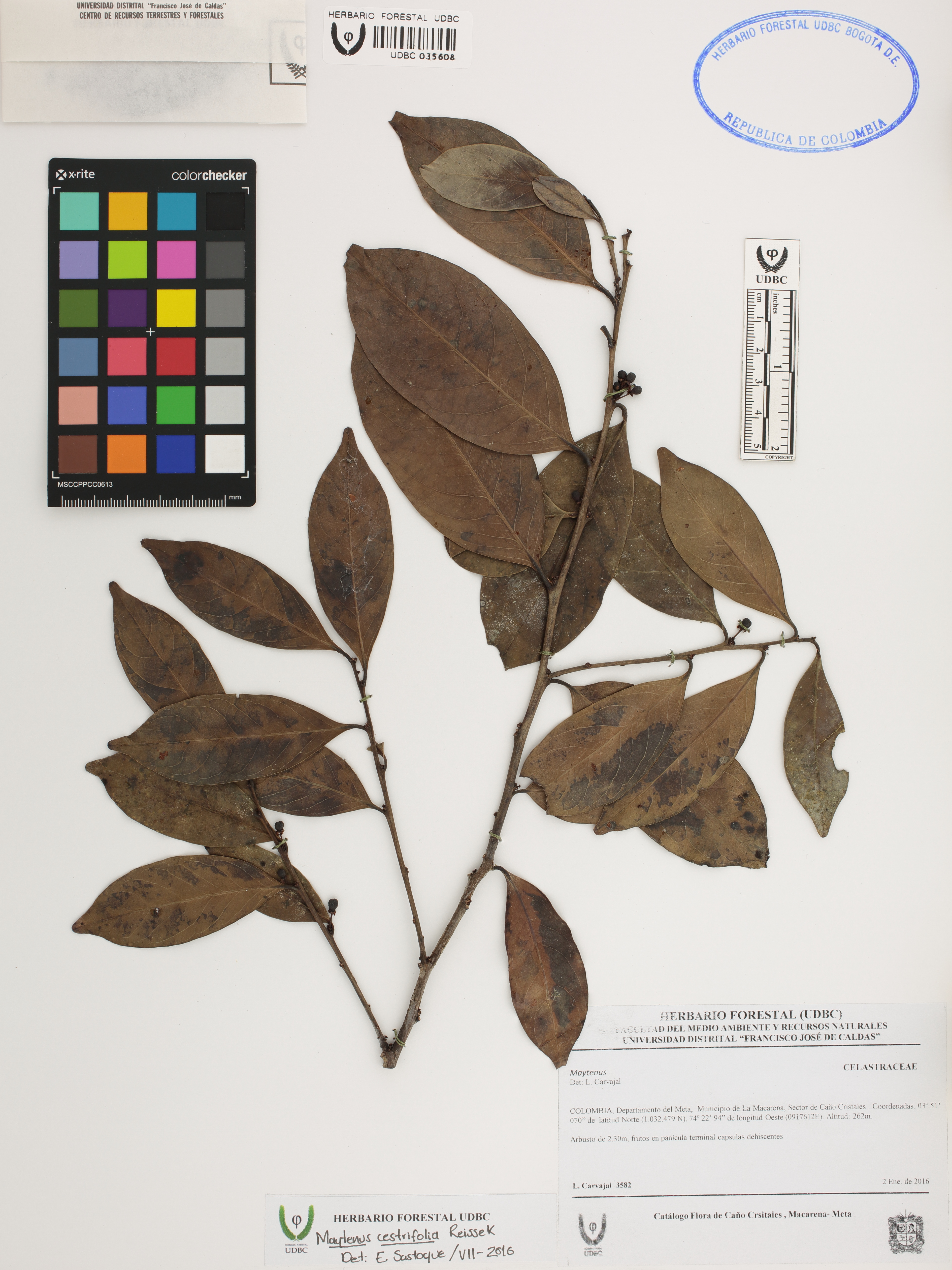 Fotografía del ejemplar Carvajal, L. 3582, determinado como Monteverdia cestrifolia en el año 2016