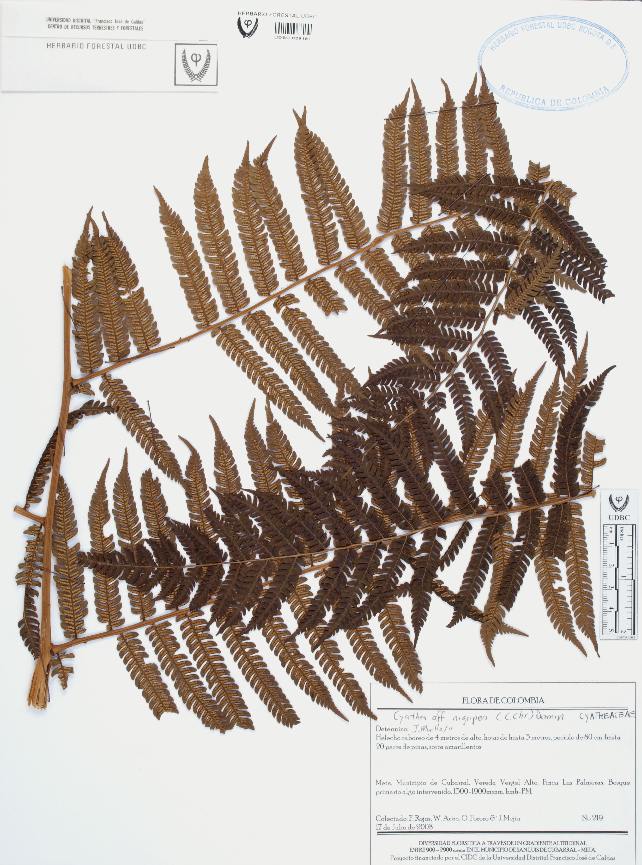 Fotografía del ejemplar Rojas, F. 219, determinado como Cyathea nigripes en el año 2011