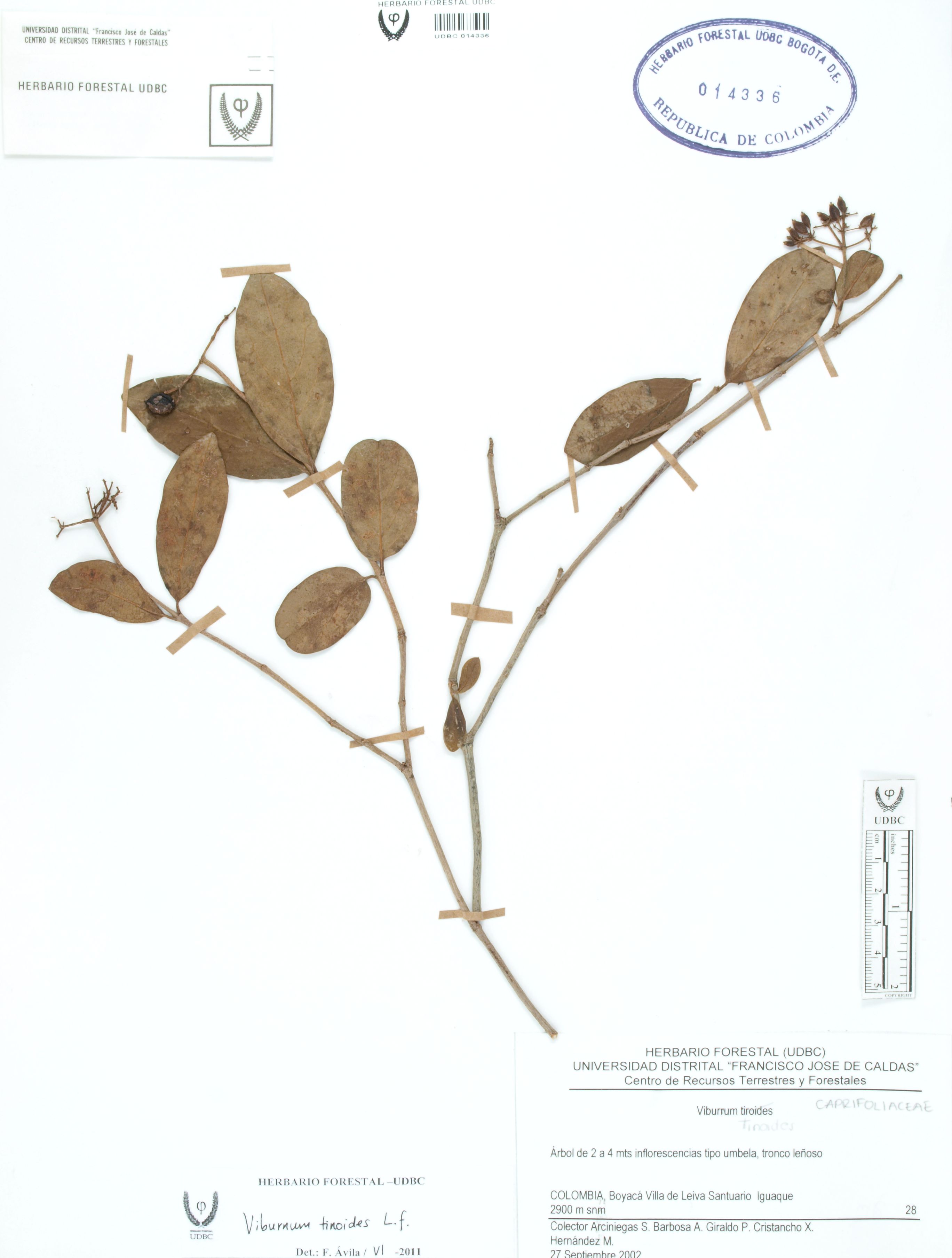Fotografía del ejemplar Arciniegas, S. 28, determinado como Viburnum tinoides en el año 2011