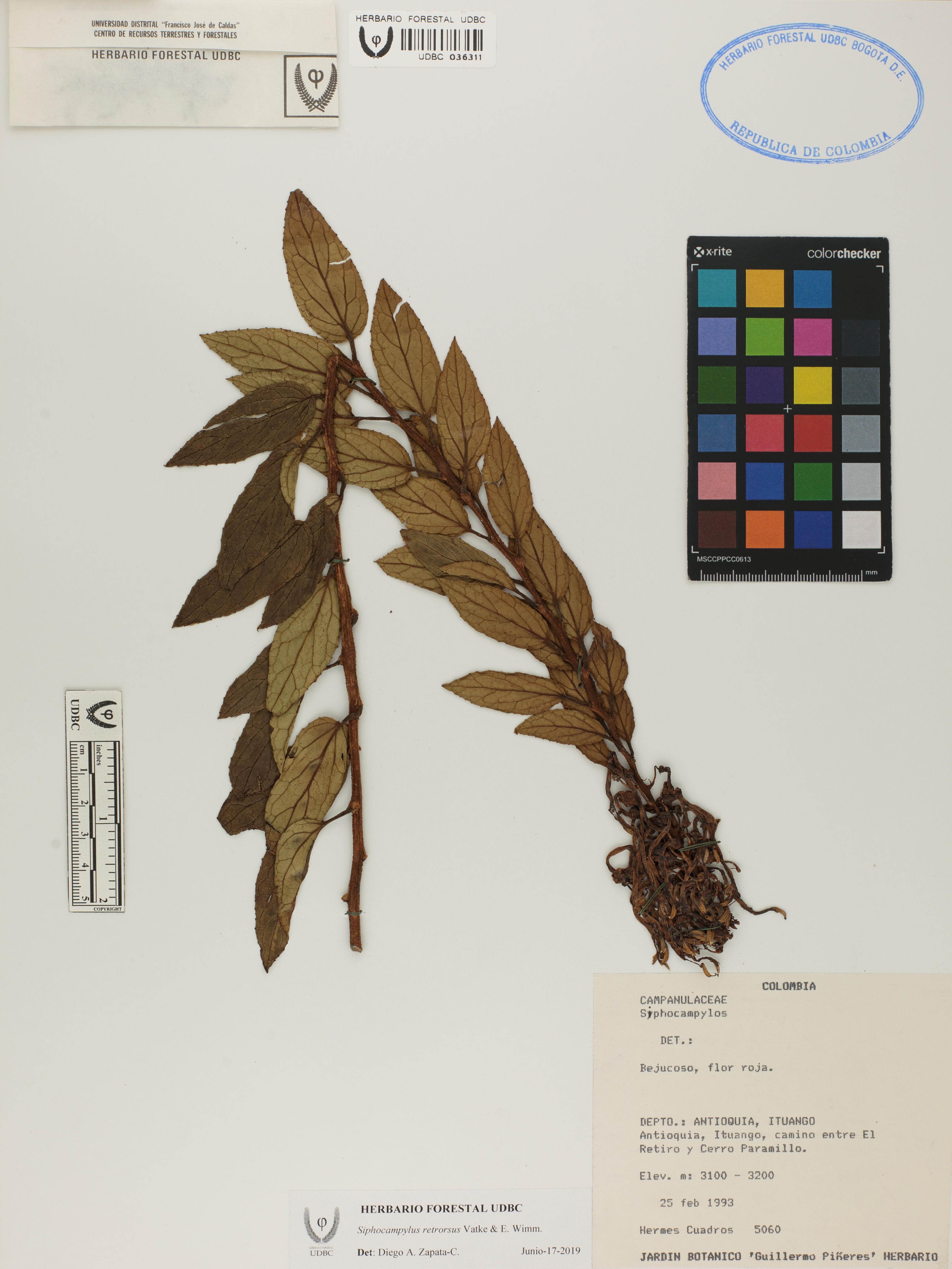 Fotografía del ejemplar Cuadros, H. 5060, determinado como Siphocampylus retrorsus en el año 2019