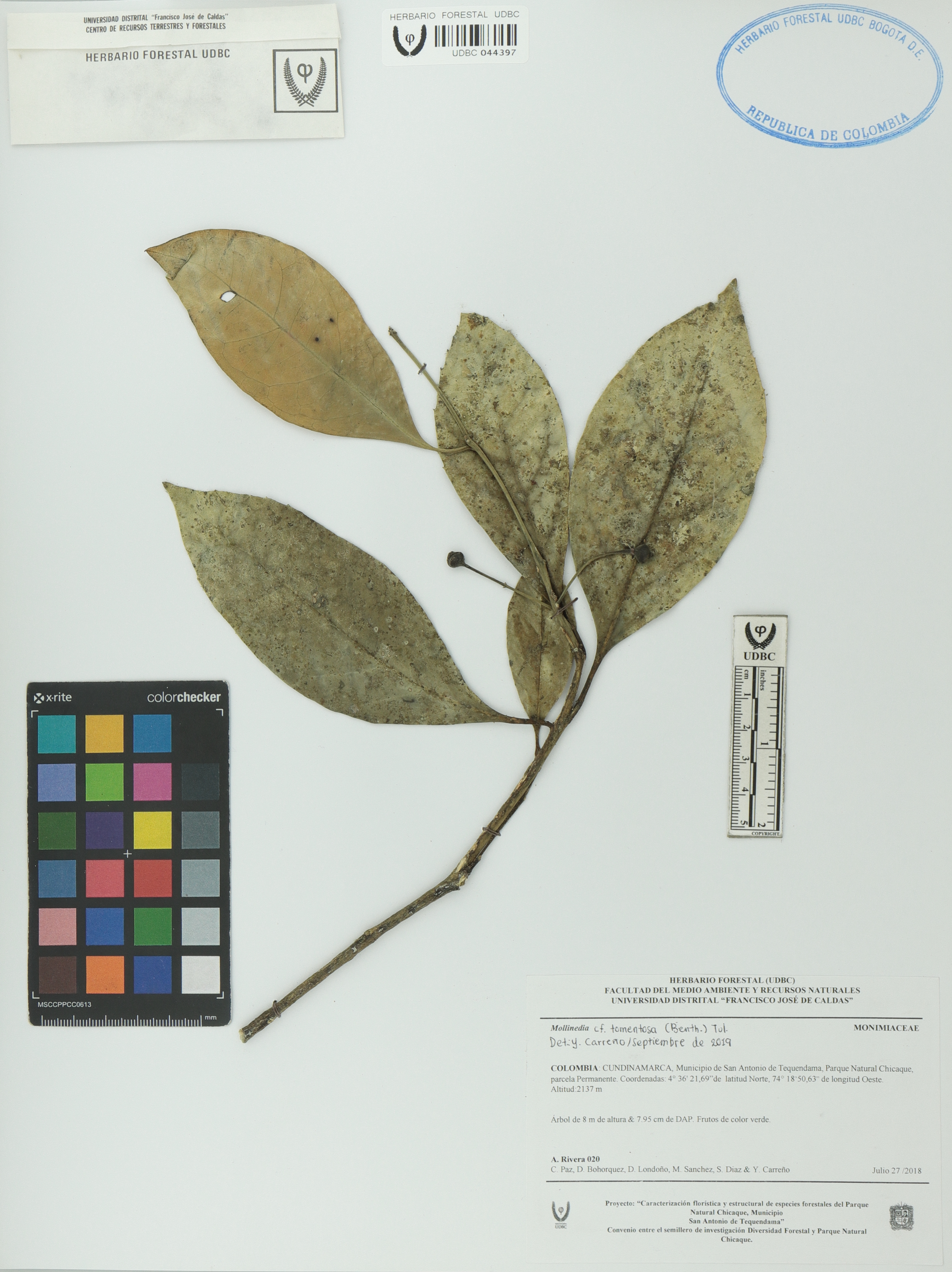 Fotografía del ejemplar Rivera, A. 20, determinado como Mollinedia tomentosa en el año 2019