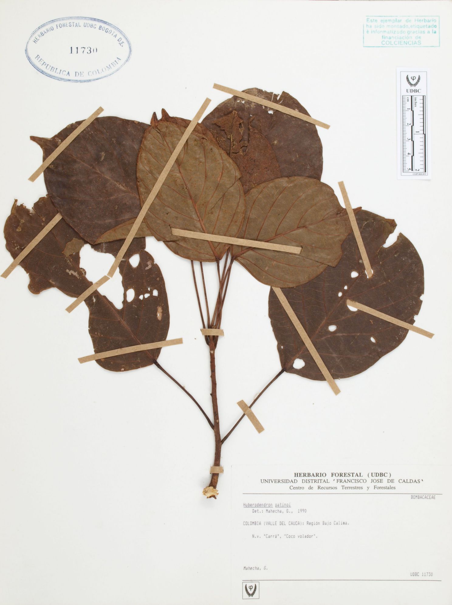 Fotografía del ejemplar Mahecha, G. 2127, determinado como Huberodendron patinoi en el año 1990