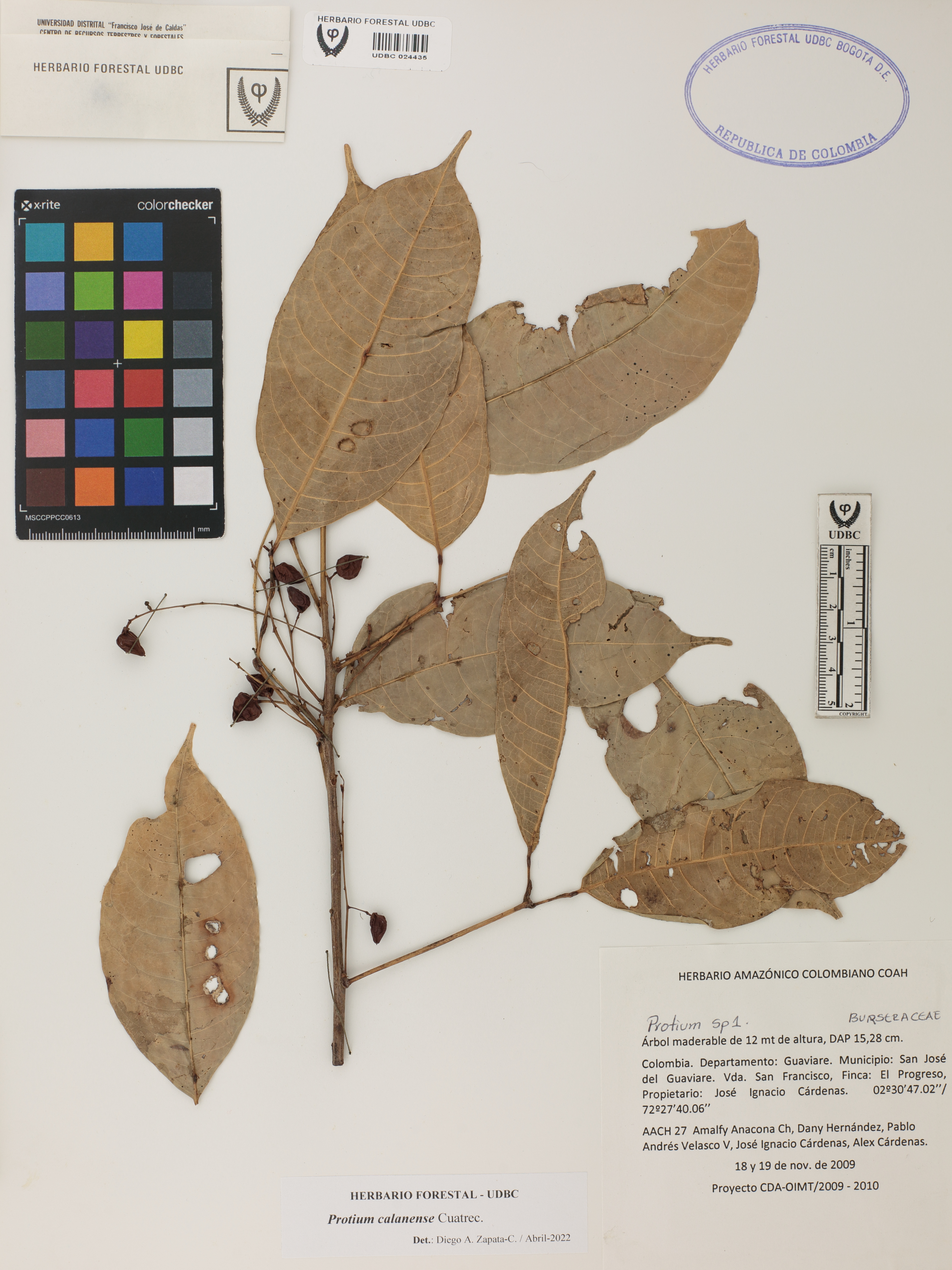 Fotografía del ejemplar Anacona, A. 27, determinado como Protium calanense en el año 2022