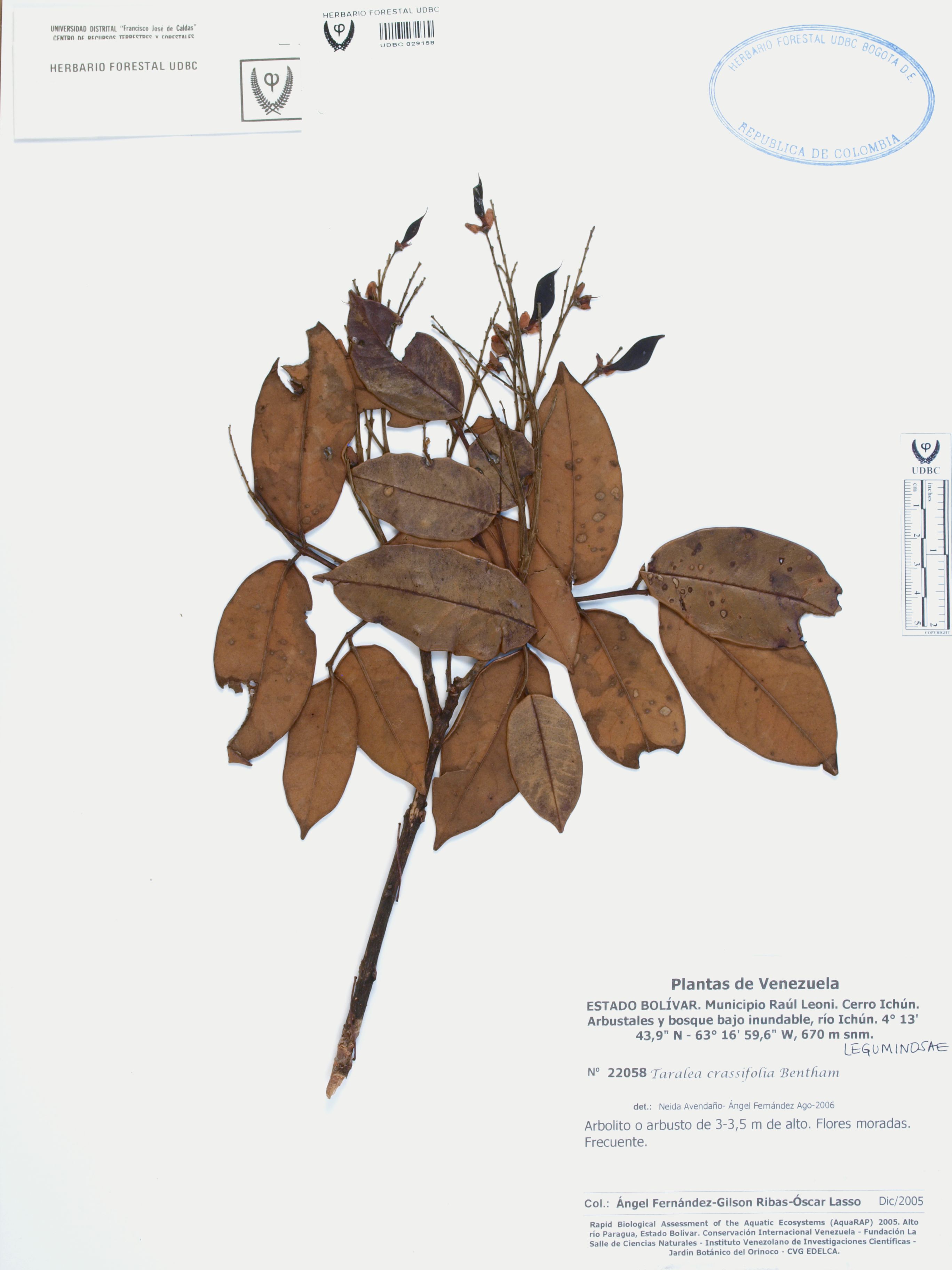 | dc.description | Fotografía del ejemplar Fernández, A. 22058, determinado como Taralea crassifolia en el año 2006 | |