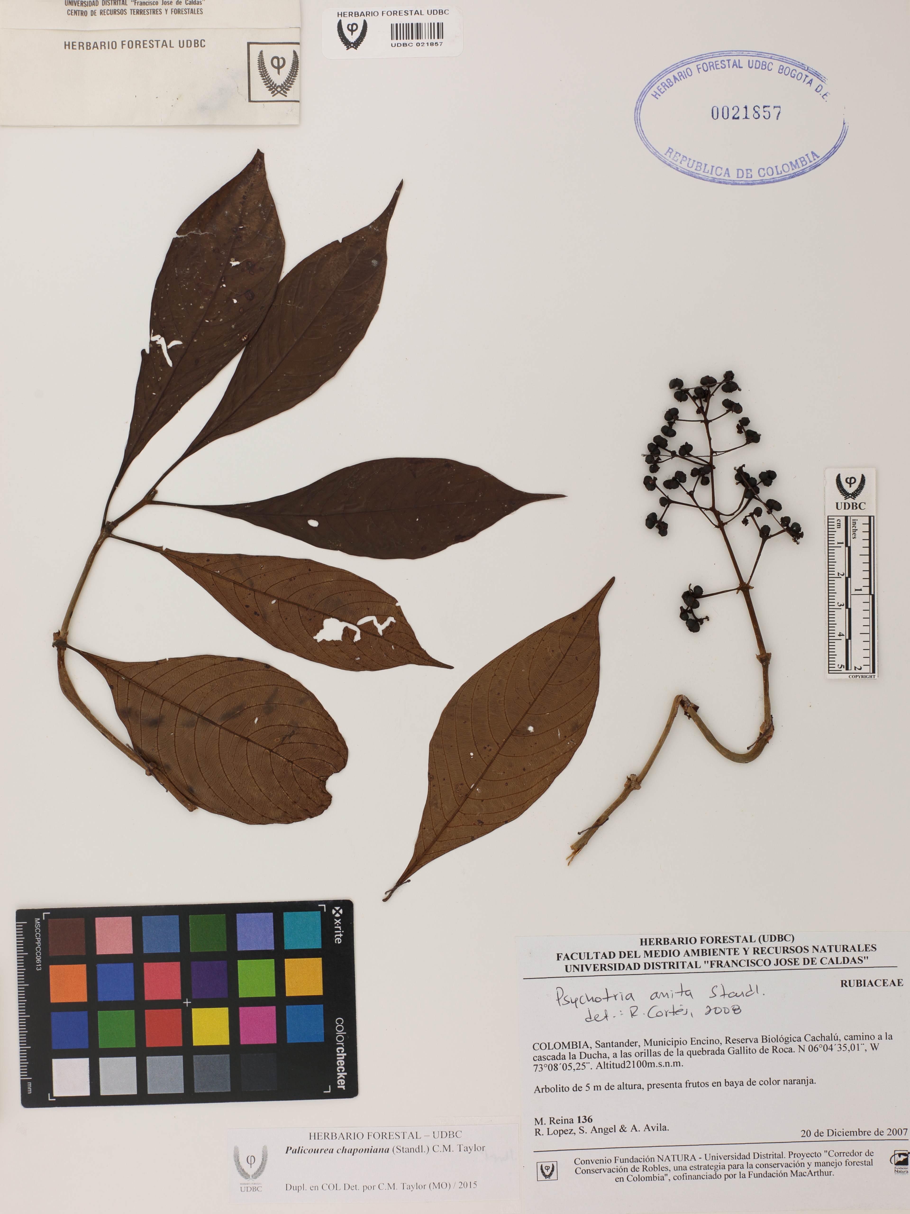 Fotografía del ejemplar Reina, M. 136, determinado como Palicourea chaponiana en el año 2015