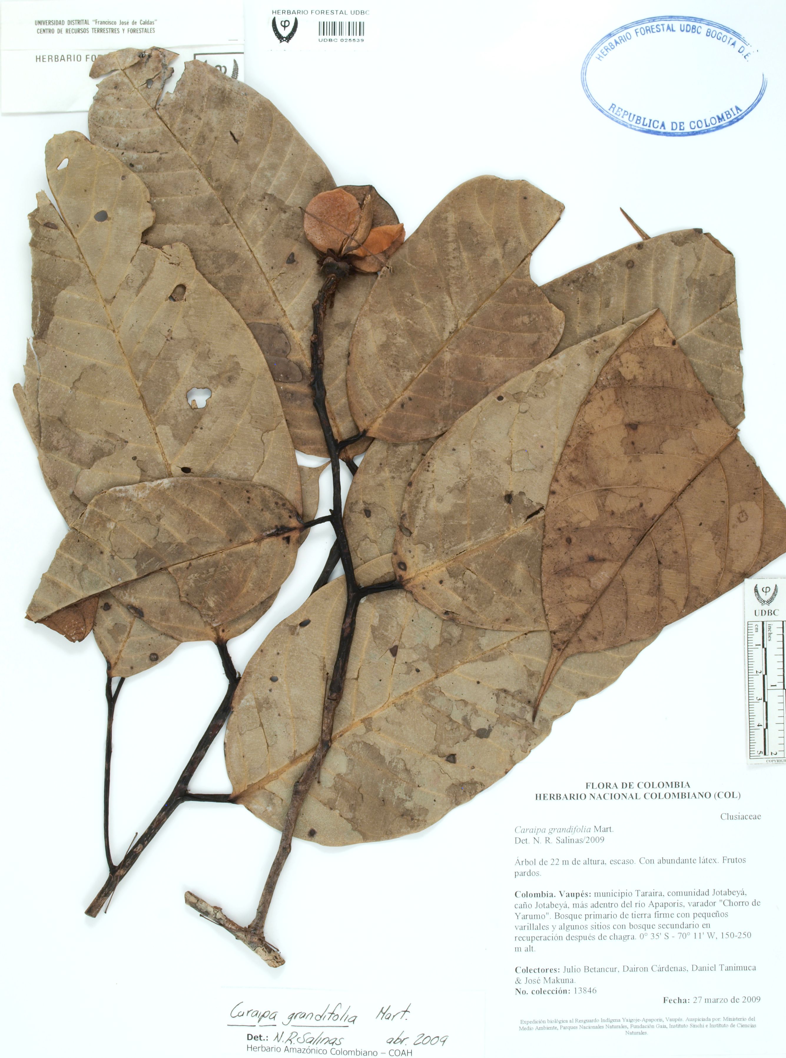 Fotografía del ejemplar Betancur, J. 13846, determinado como Caraipa grandifolia en el año 2009