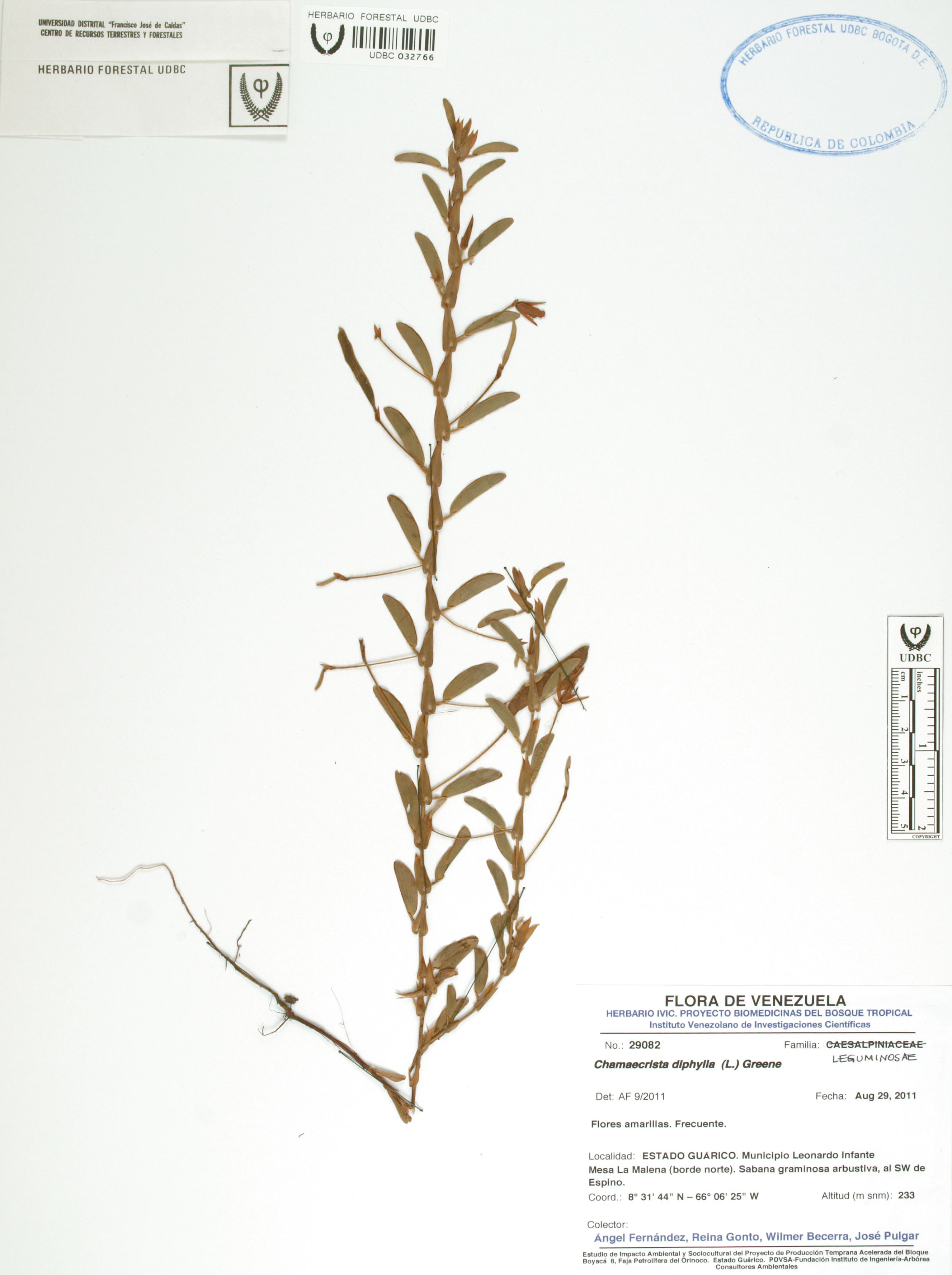 Fotografía del ejemplar Fernández, A. 29082, determinado como Chamaecrista diphylla en el año 2011