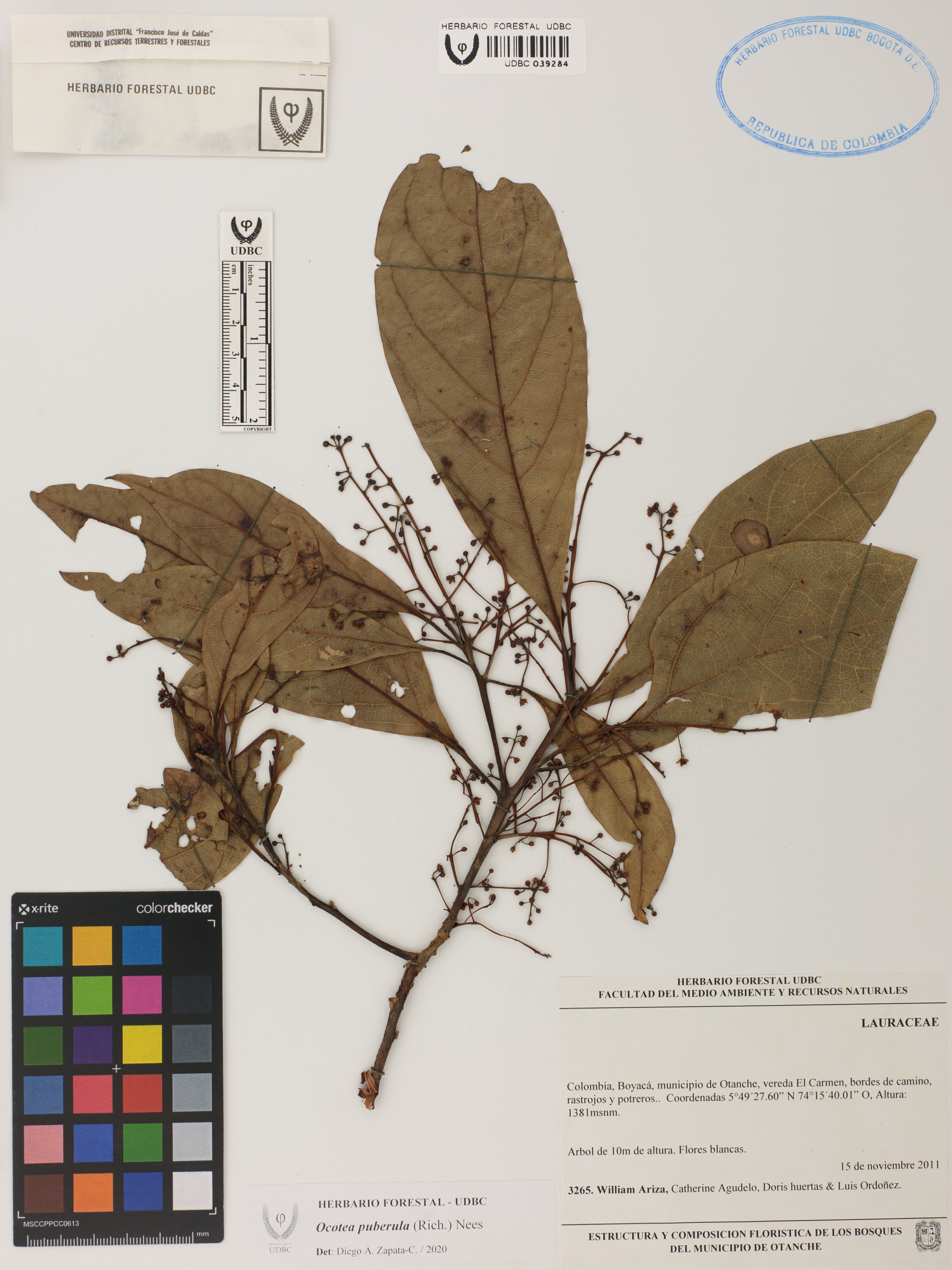 Fotografía del ejemplar Ariza, W. 3265, determinado como Ocotea puberula en el año 2020