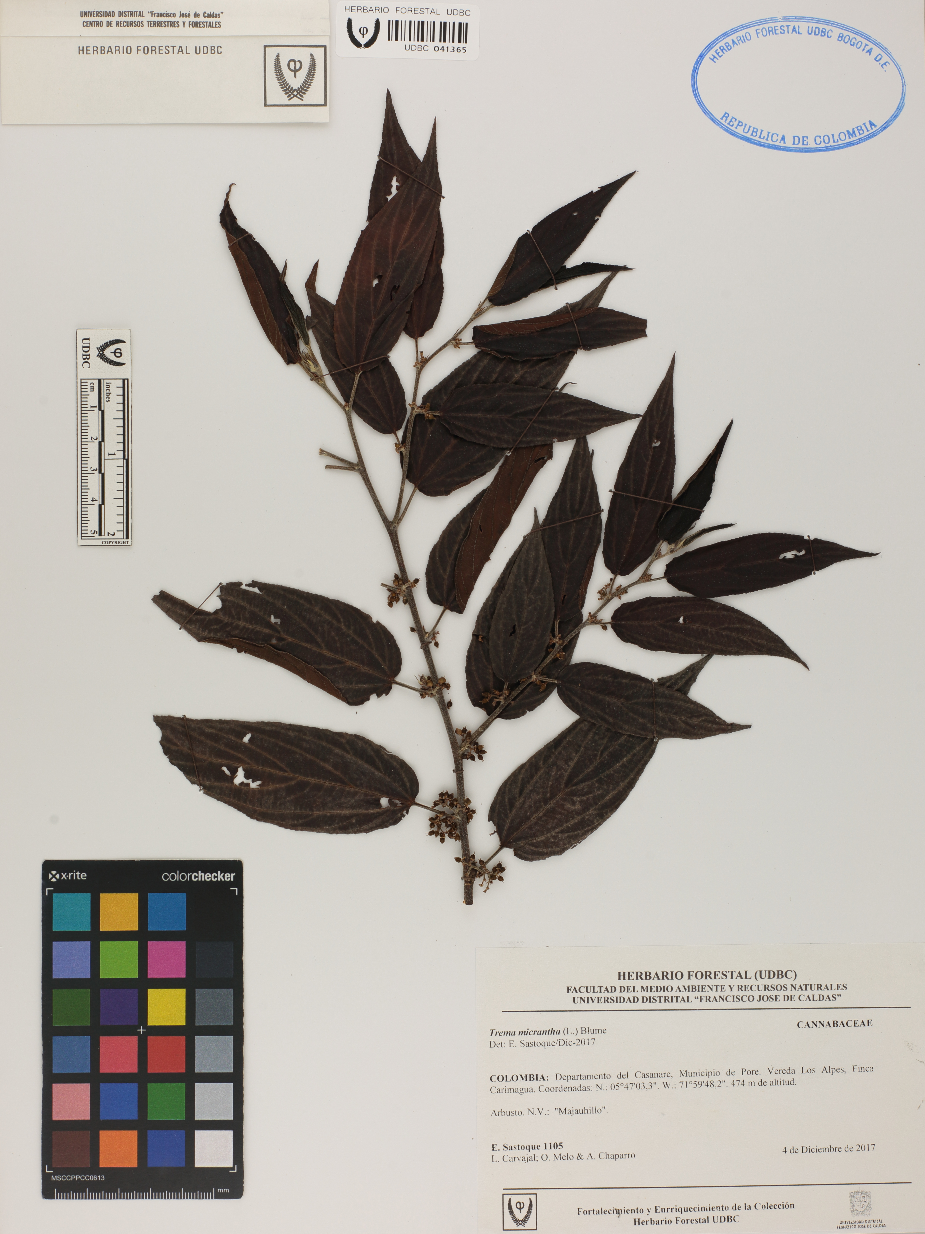 Fotografía del ejemplar Sastoque, E. 1105, determinado como Trema micranthum en el año 2017