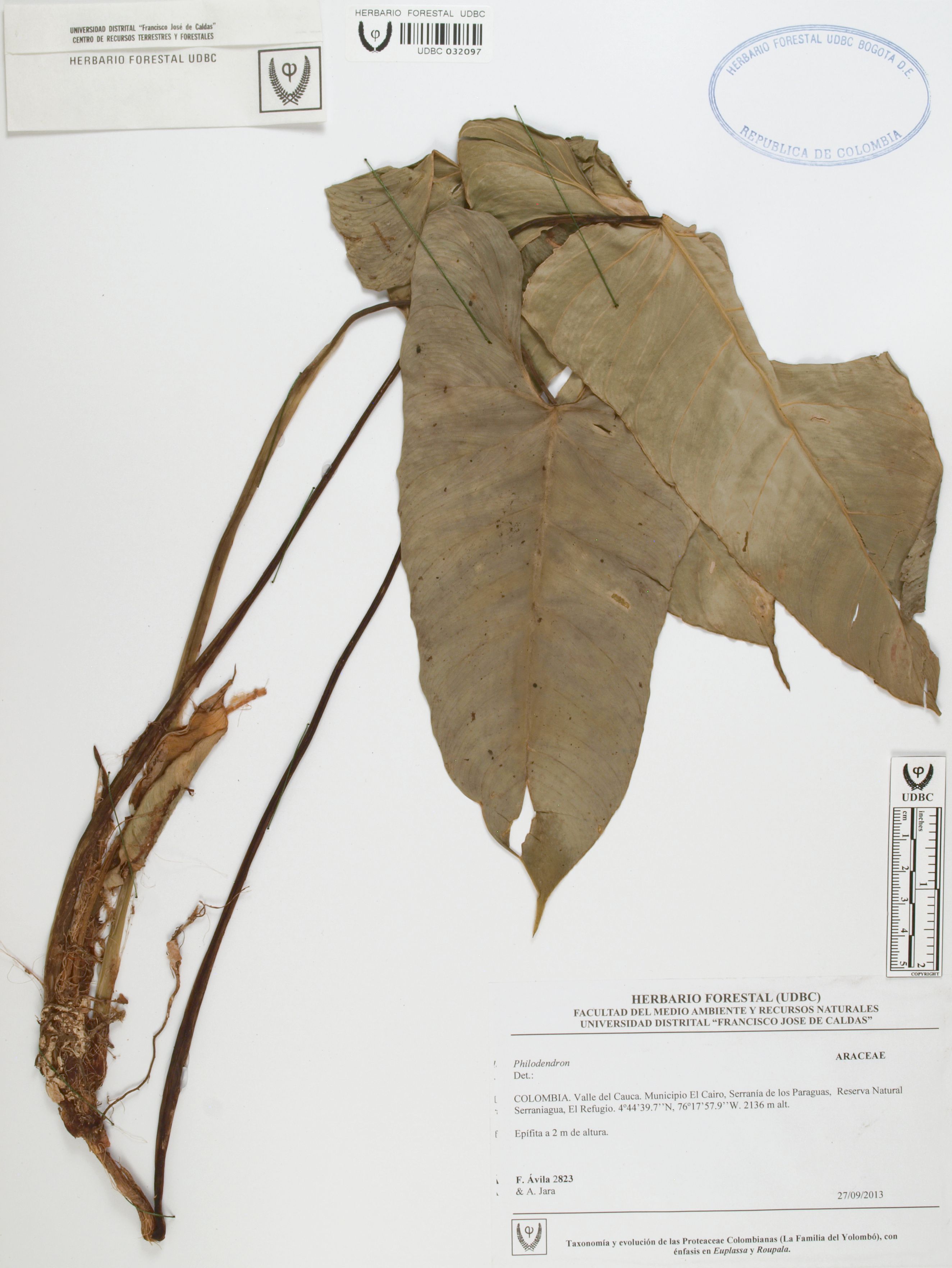 Fotografía del ejemplar Ávila, F. 2823, determinado como Philodendron sp.