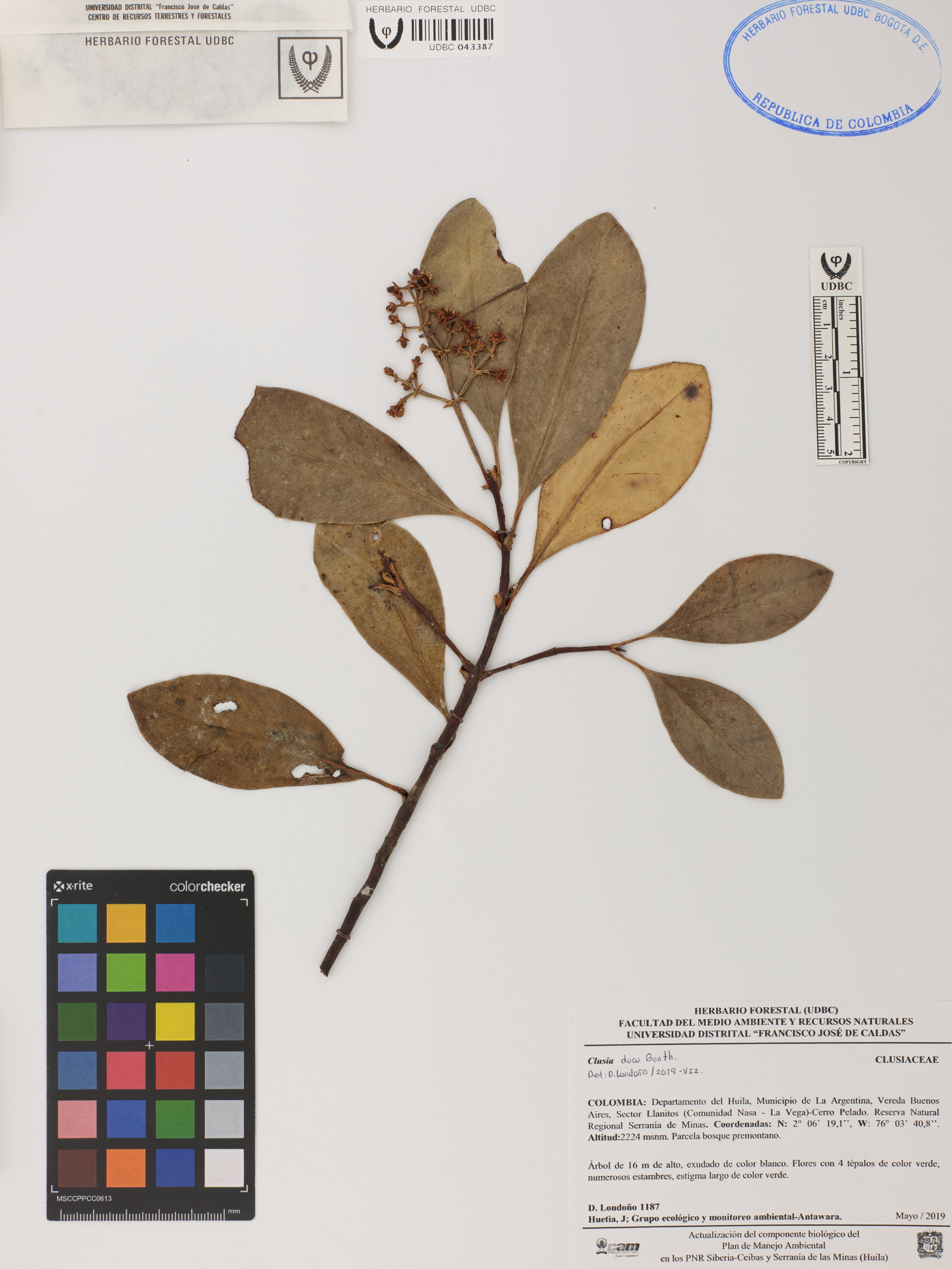 Fotografía del ejemplar Londoño, D. 1187, determinado como Clusia ducu en el año 2019