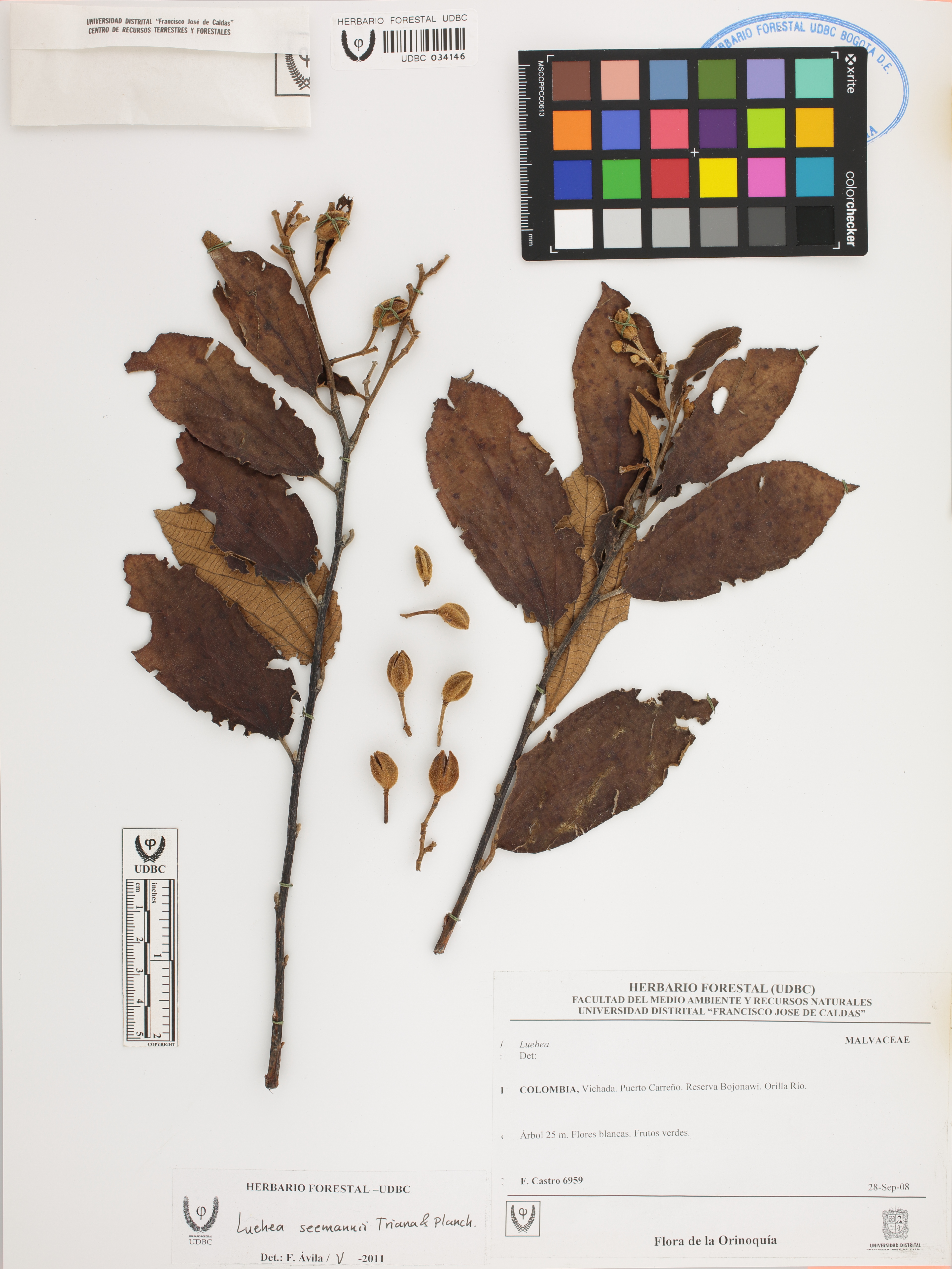 Fotografía del ejemplar Castro, F. 6959, determinado como Luehea seemannii en el año 2011