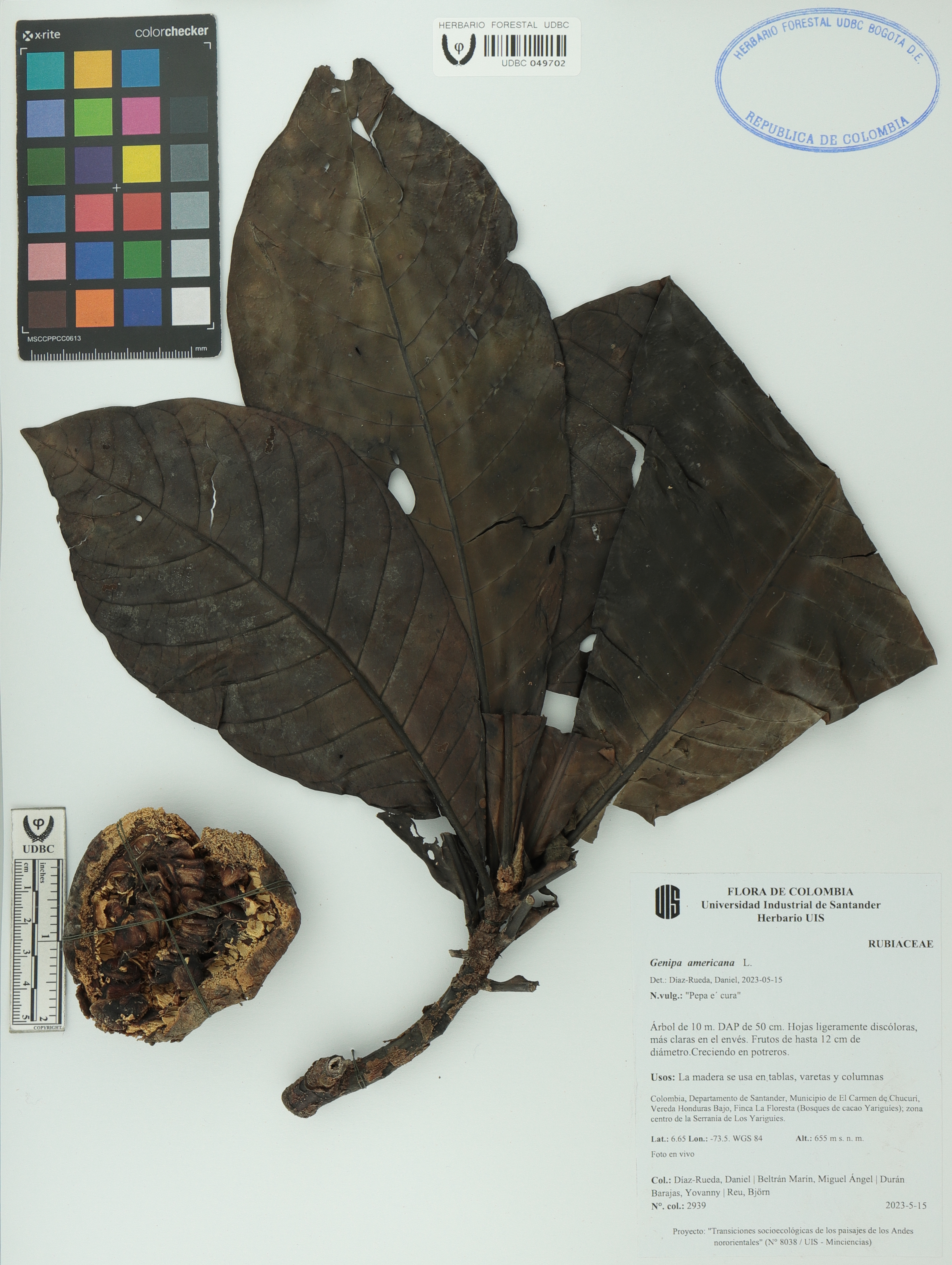 Fotografía del ejemplar Díaz-Rueda, D. 2939, determinado como Genipa americana en el año 2023