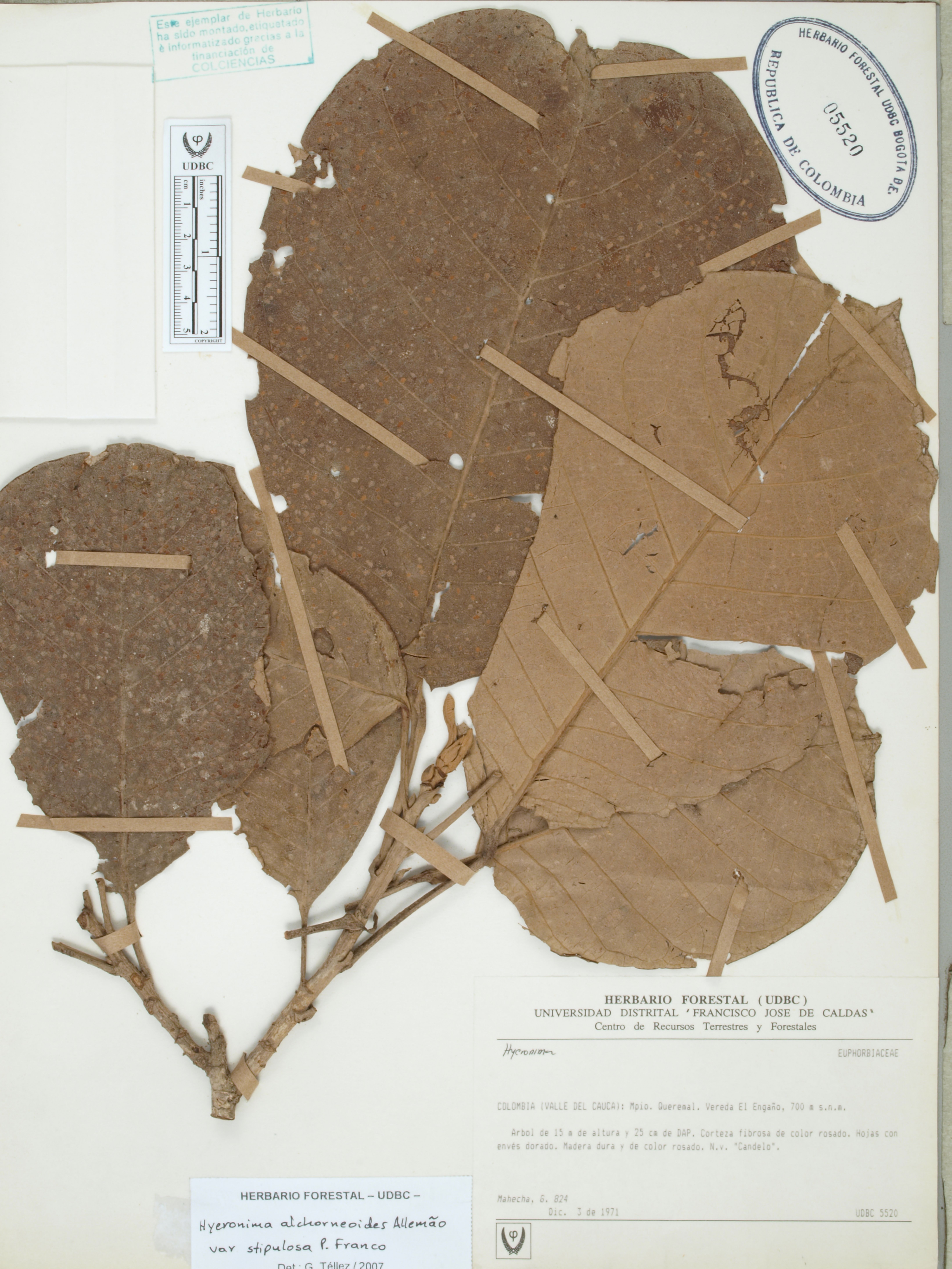 Fotografía del ejemplar Mahecha, G. 824, determinado como Hieronyma alchorneoides var. stipulosa en el año 2007