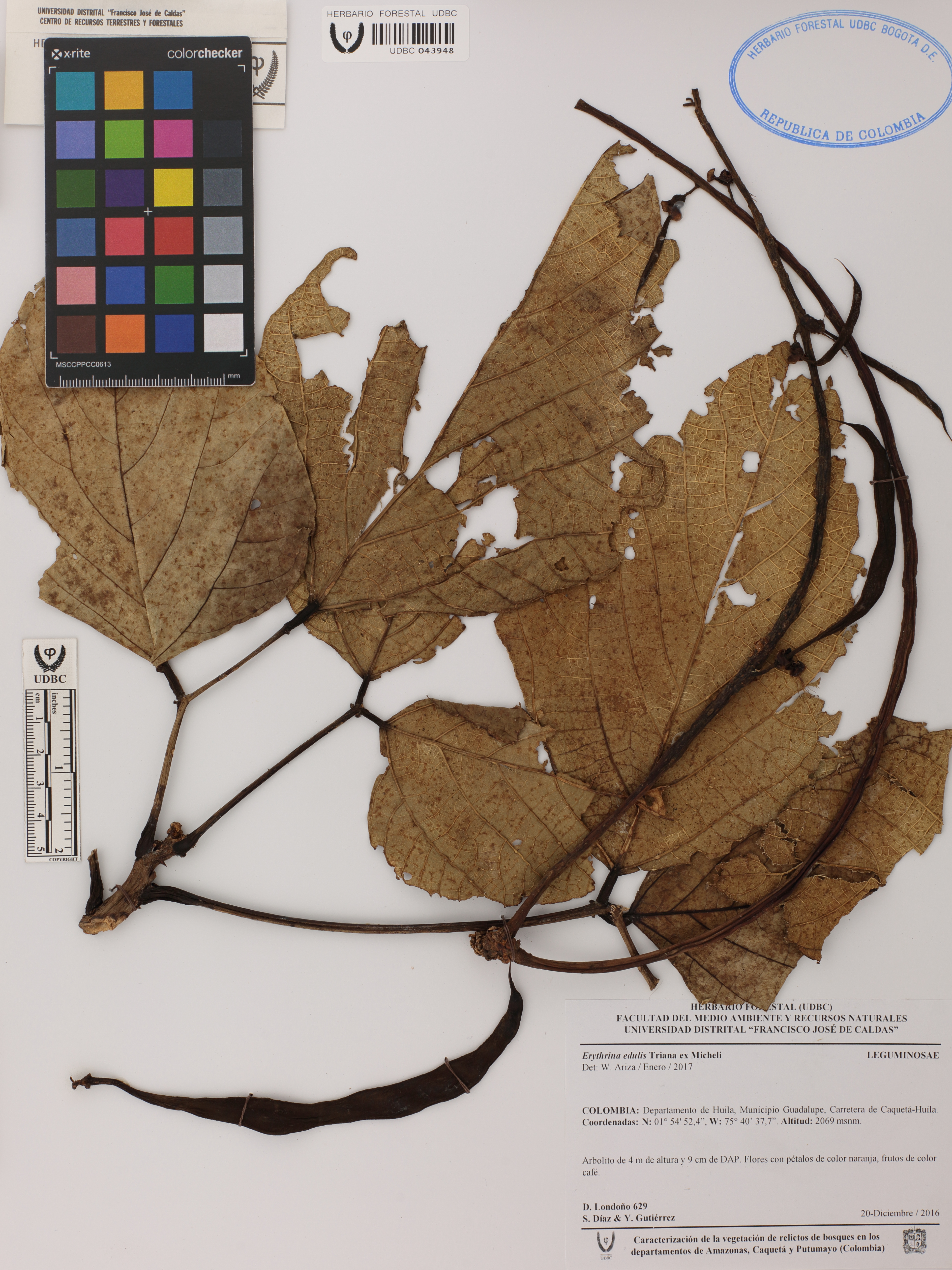 Fotografía del ejemplar Londoño, D. 629, determinado como Erythrina edulis en el año 2017
