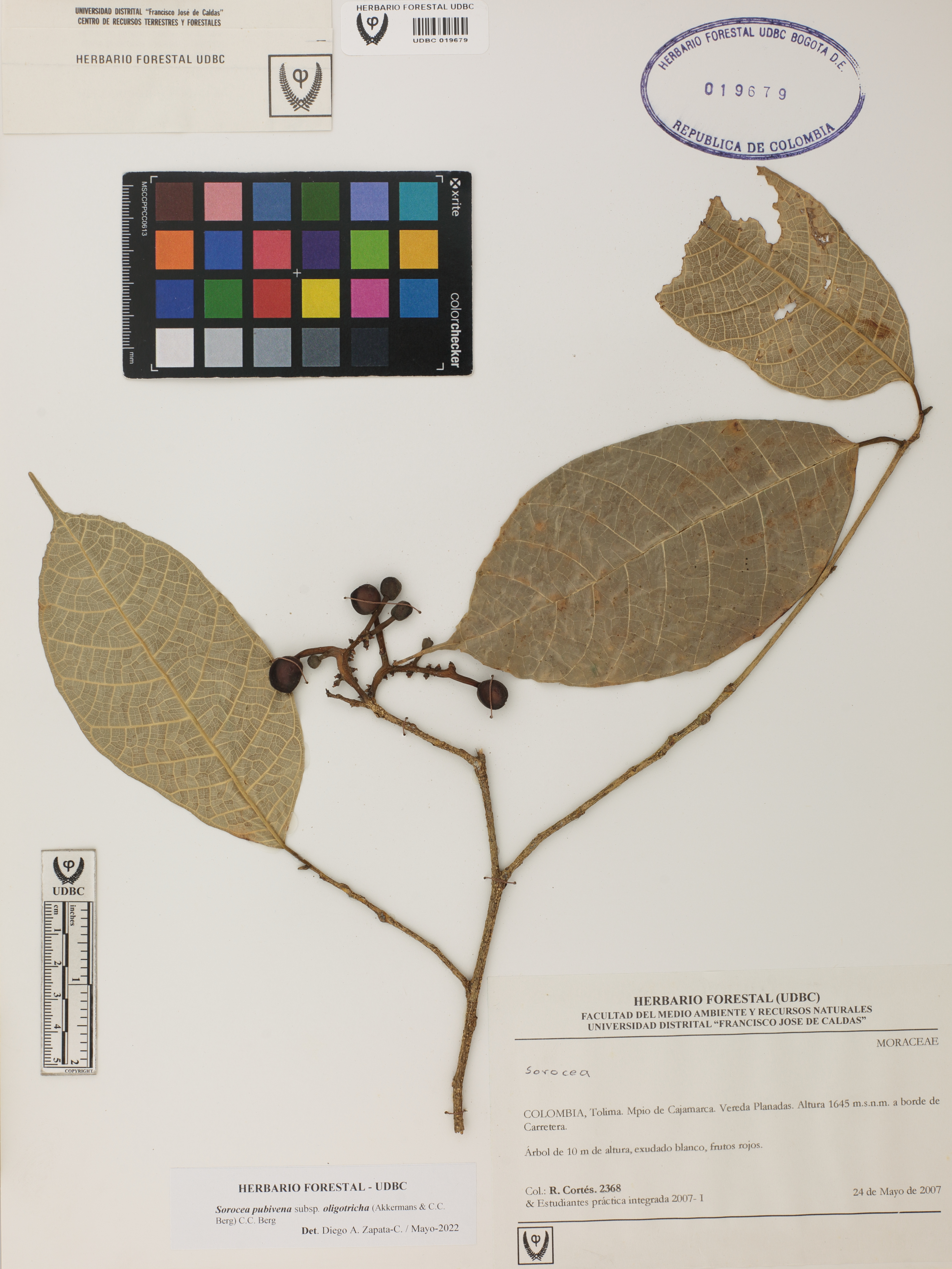 Fotografía del ejemplar Cortés-B., R. 2368, determinado como Sorocea pubivena subsp. oligotricha en el año 2022