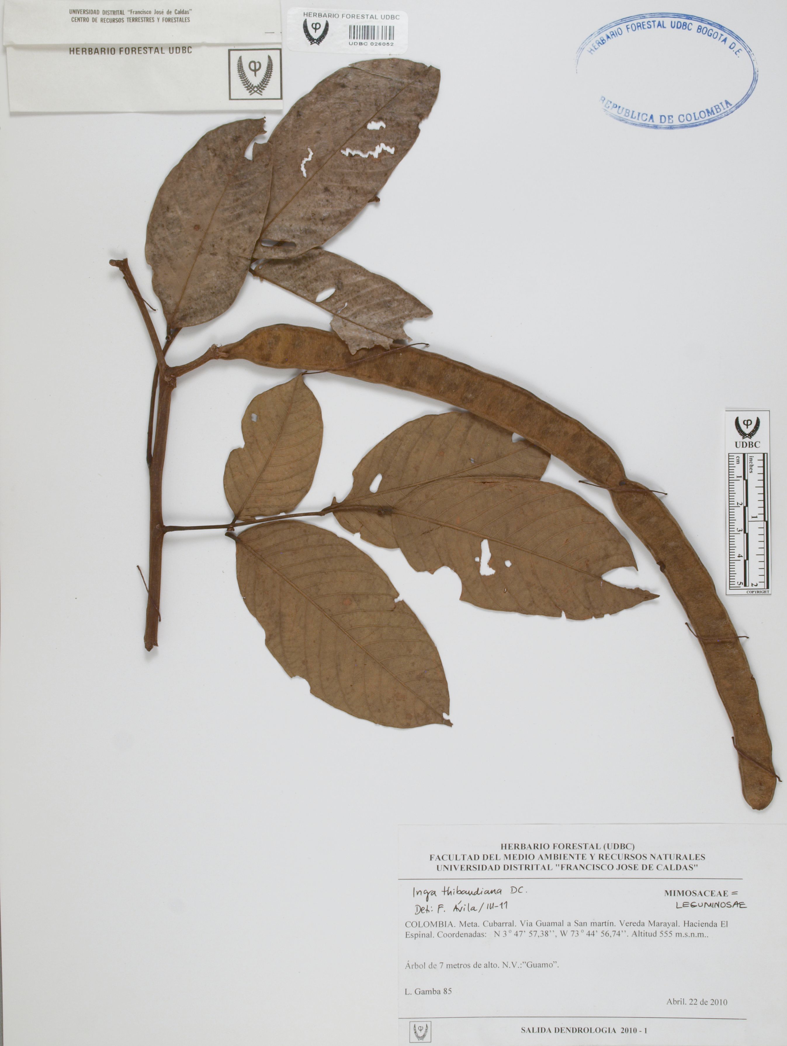 Fotografía del ejemplar Gamba, L. 85, determinado como Inga thibaudiana en el año 2011