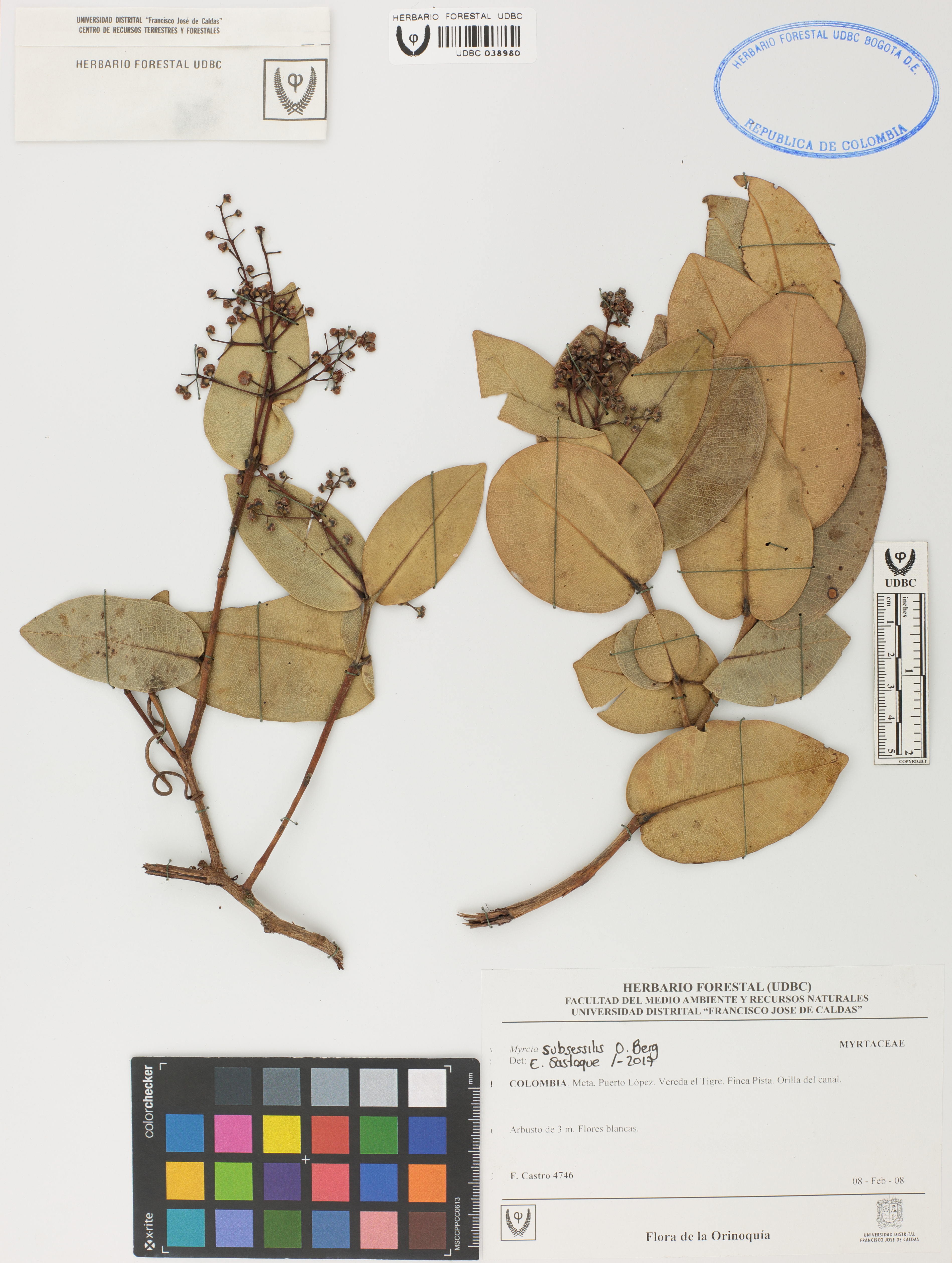 Fotografía del ejemplar Castro, F. 4746, determinado como Myrcia subsessilis en el año 2017