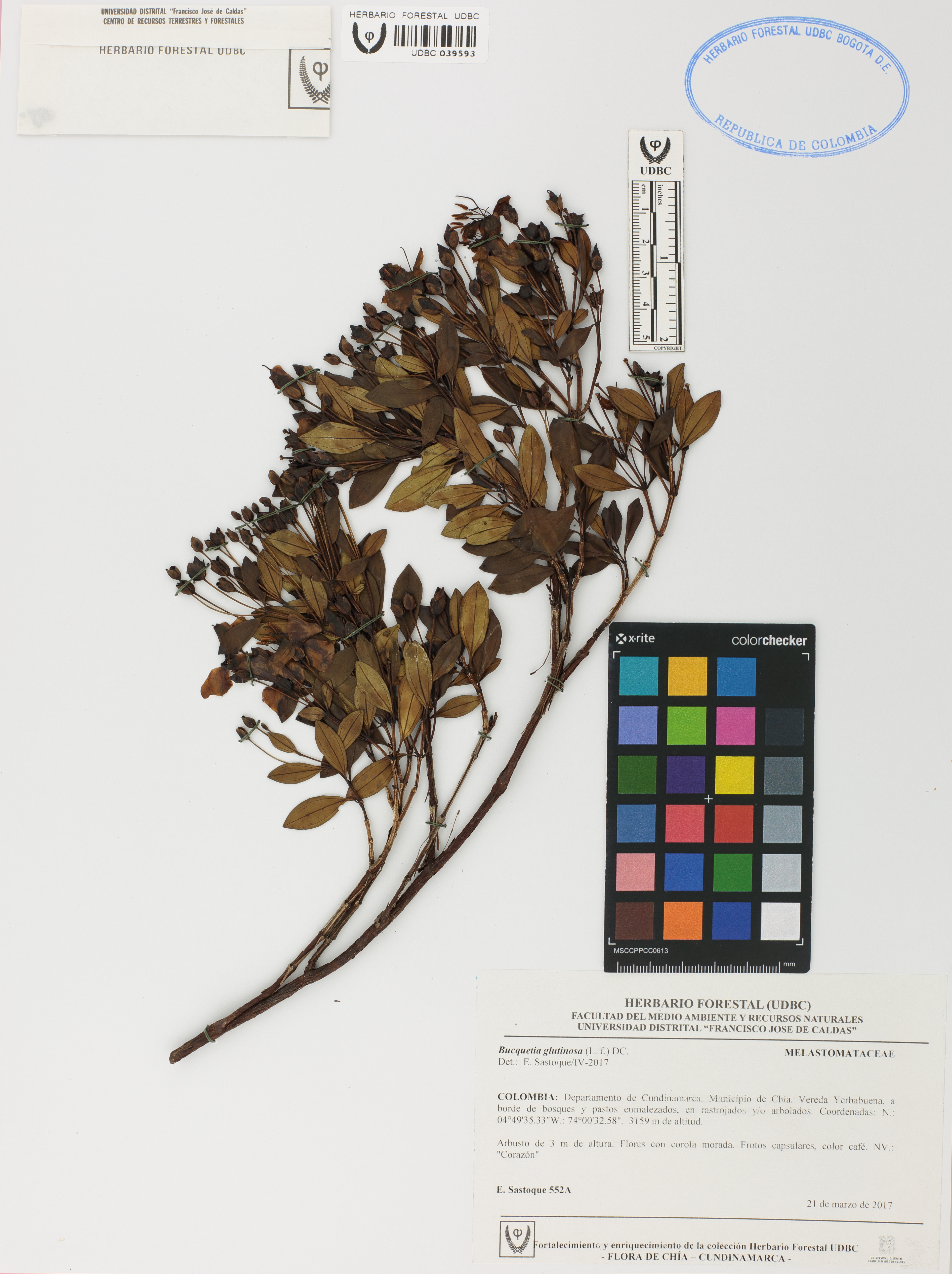 Fotografía del ejemplar Sastoque, E. 552A, determinado como Bucquetia glutinosa en el año 2017