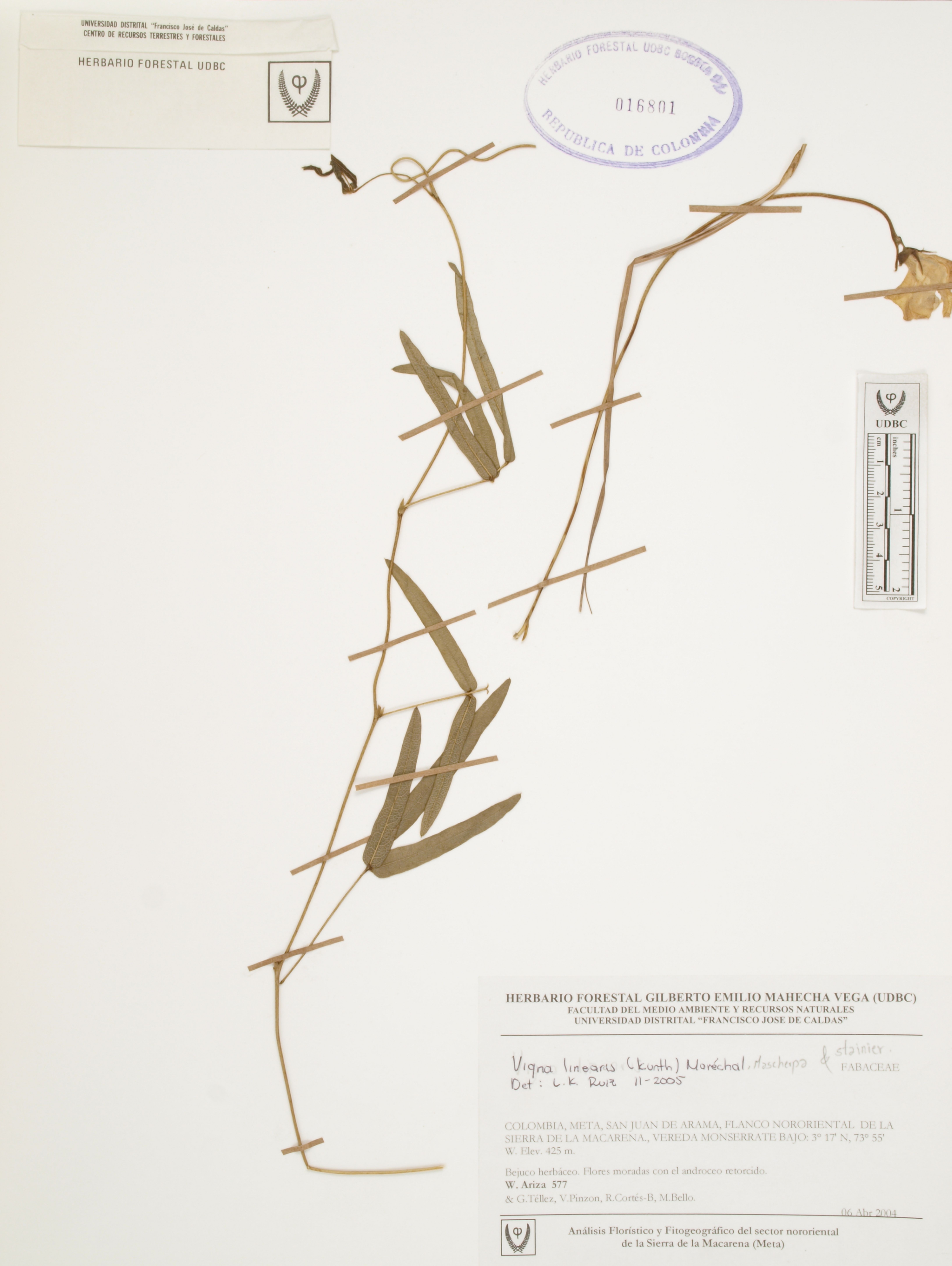 Fotografía del ejemplar Ariza, W. 577, determinado como Vigna linearis en el año 2005
