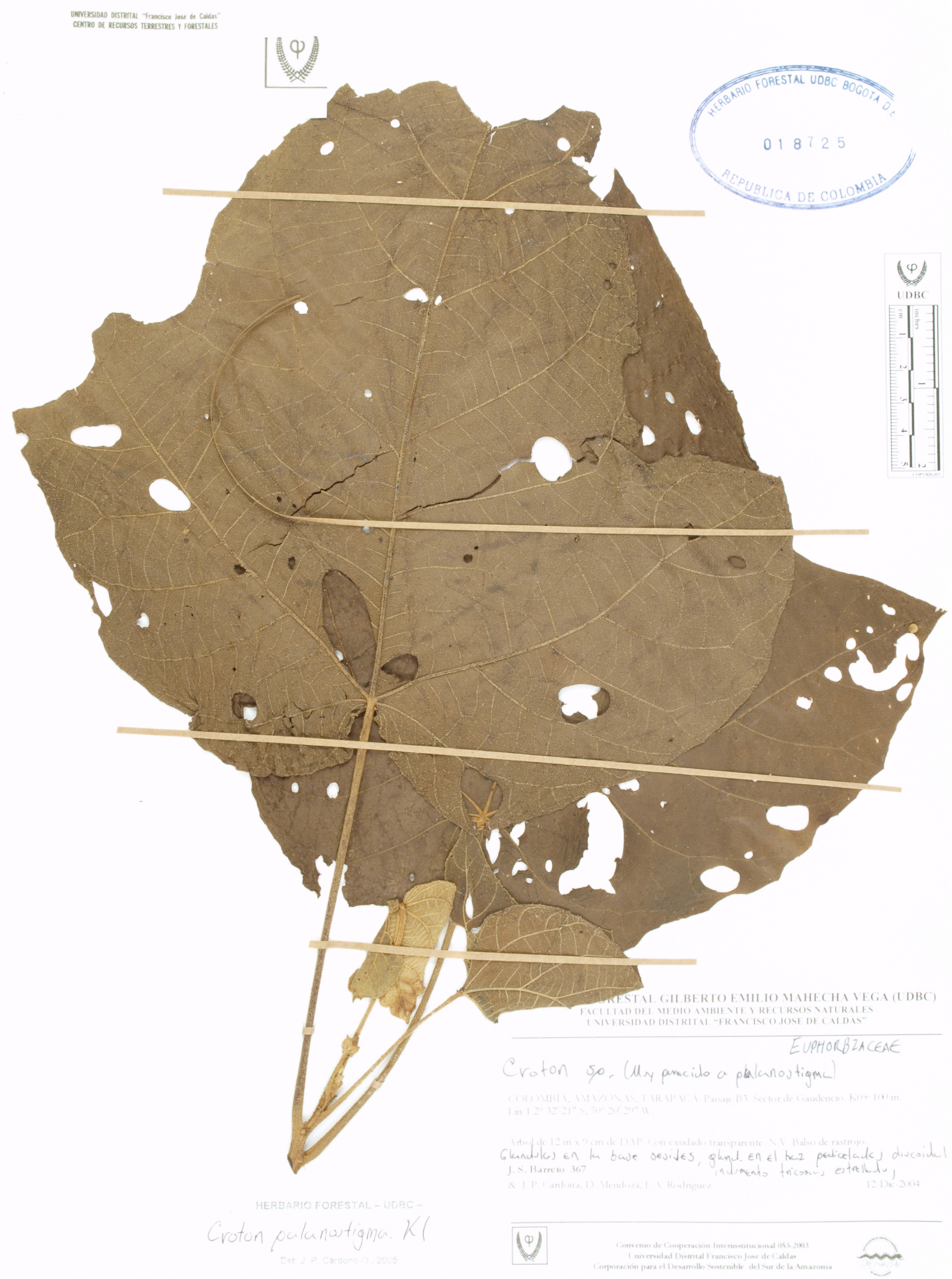 Fotografía del ejemplar Barreto, J. 367, determinado como Croton palanostigma en el año 2005
