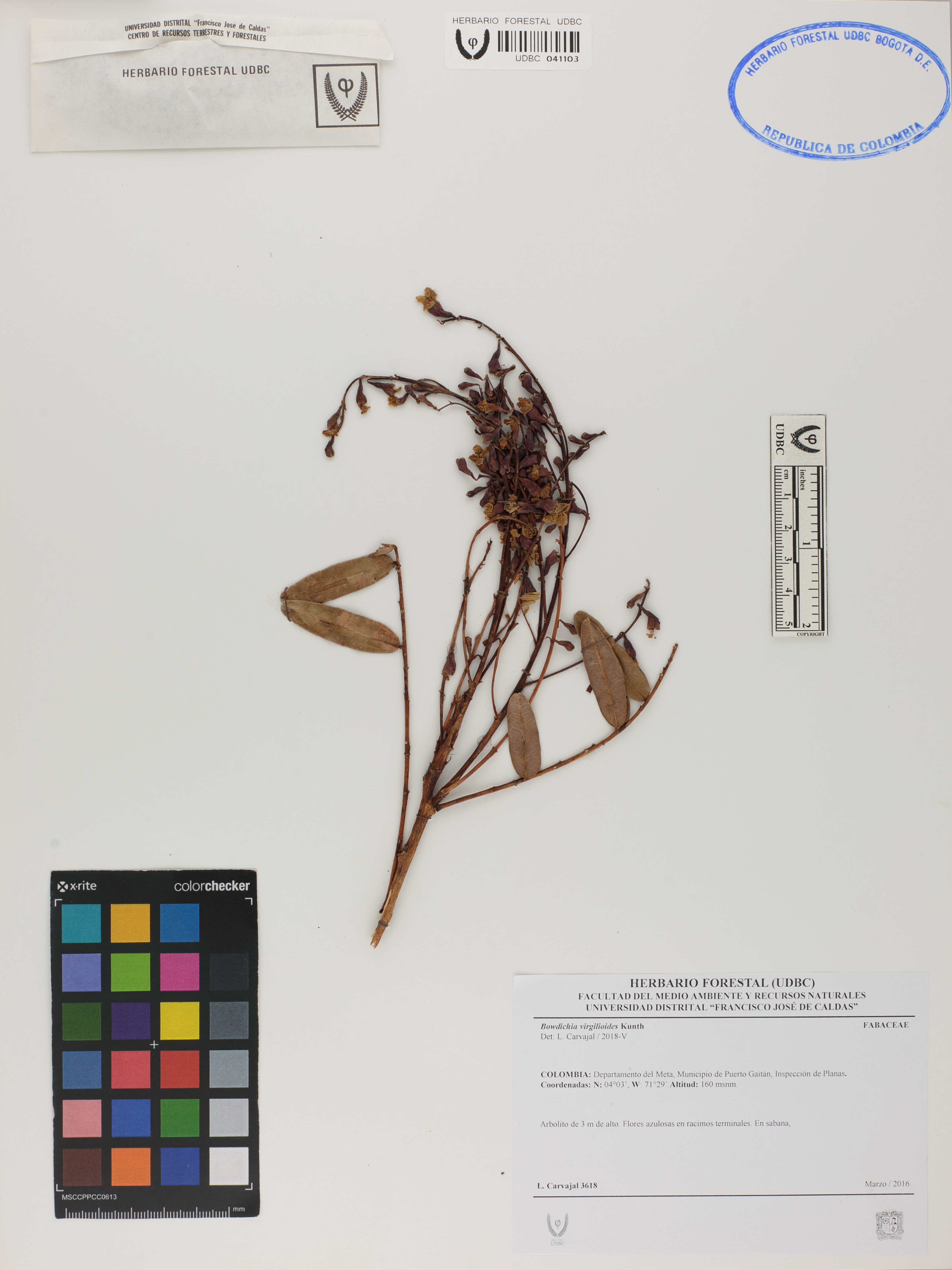 Fotografía del ejemplar Carvajal, L. 3618, determinado como Bowdichia virgilioides en el año 2018